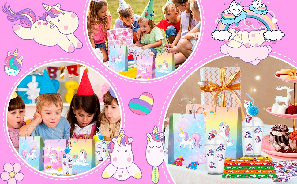 - 🦄Незабываемая вечеринка🦄 Эти наполнители для сумок для девочек в виде единорогов с милыми узорами в виде единорогов и яркими цветами являются почти идеальным дополнением к украшениям для девочек на день рождения в виде единорогов, легко создают незабываемые тематические вечеринки в стиле единорогов и радуют ваших гостей.
