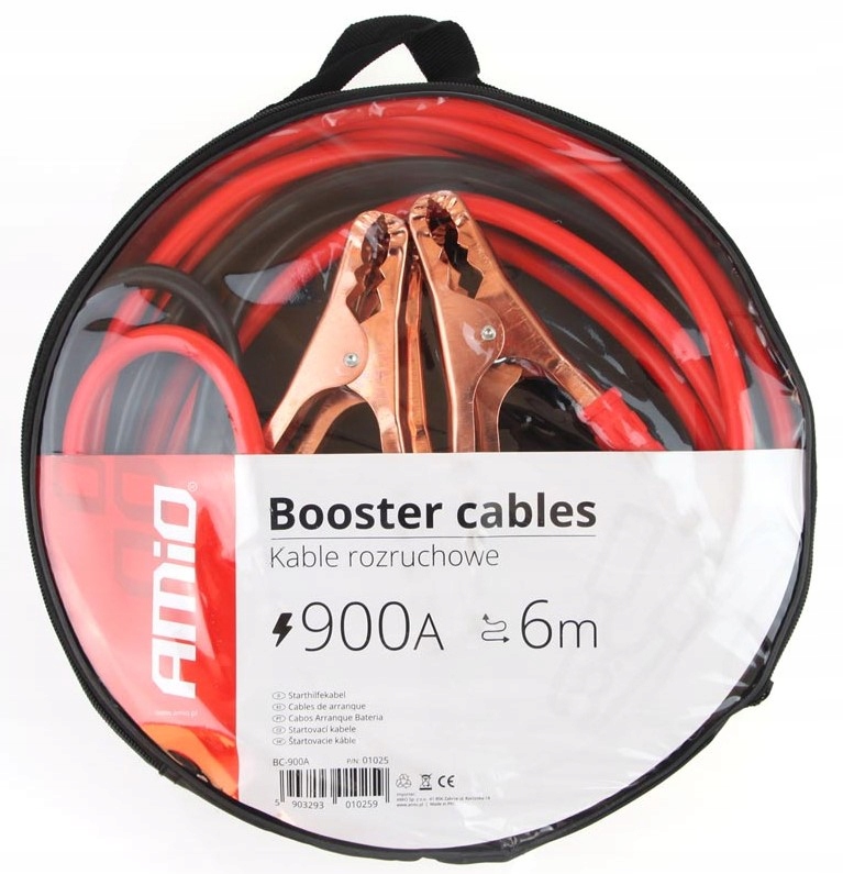 - В комплект входят два кабеля длиной 6 метров двух цветов (черный и красный) с прочными широко открывающимися зажимами