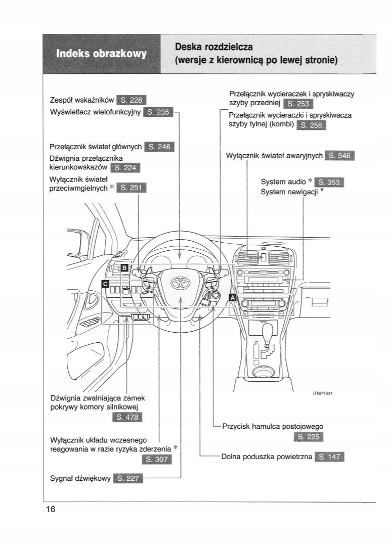 Руководство владельца Toyota содержит все версии оборудования и полезную информацию о том, как эффективно и безопасно использовать автомобиль, например: - указатели поворота, контрольные лампы открытия и закрытия - освещение и обзорность, сиденья, отсеки для хранения вещей, отопление, вентиляция, кондиционирование воздуха. - советы по вождению, эксплуатации, обслуживанию автомобиля - уровни жидкостей, проверка и доливка, аварийные операции, замена колес, предохранителей, замена лампочек - технические данные... и многое другое, что дает путешественникам ощущение безопасности и комфорта.Польское законодательство обязывает продавца приложить к . Руководство пользователя автомобиля новое, на польском языке.