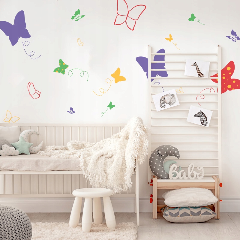 Nakleo Kids Collection представляют собой наборы из четырнадцати трафаретов из прочного пластика, состоящих из листов разного размера (самый большой 34х34см). Шаблоны можно использовать любое количество раз, поэтому вы легко сможете покрыть даже самые большие стены любой композицией узоров и цветов. Дайте волю своему воображению и порадуйте себя и своего ребенка. Узор «Бабочки» позволяет создать собственную композицию из летающих повсюду бабочек разных цветов и форм.