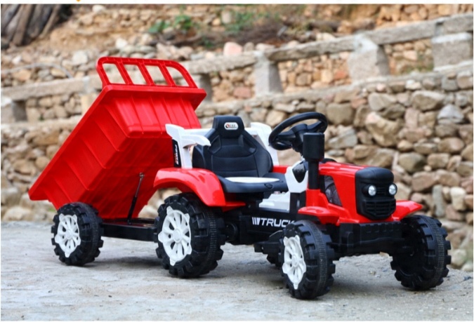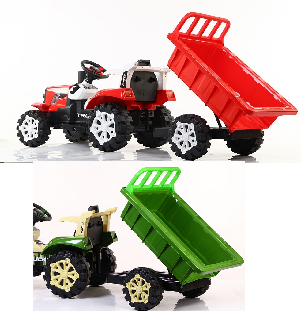 Трактор на аккумуляторе. Он приводится в движение двумя мощными электродвигателями, питаемыми от аккумулятора емкостью 6В7Ач. Автомобиль оснащен звуковыми эффектами, активируемыми кнопками, USB-портом для флэш-накопителя, регулятором громкости и светодиодными фонарями. Есть 3 скорости движения, вперед и назад. Безопасные уроки вождения обеспечиваются новейшим пультом дистанционного управления 2.4G, который дает родителю полный контроль над автомобилем. Съемный прицеп.