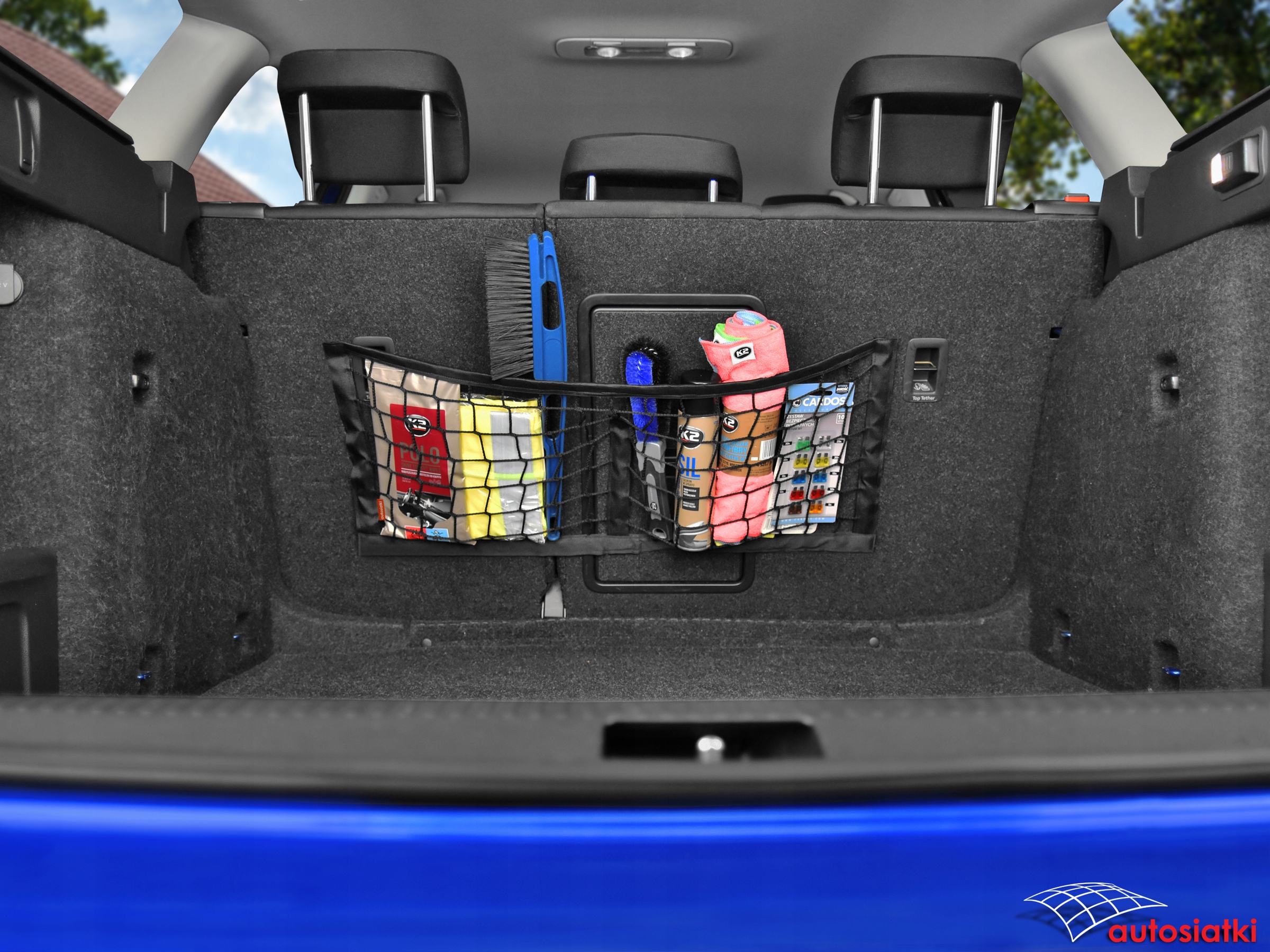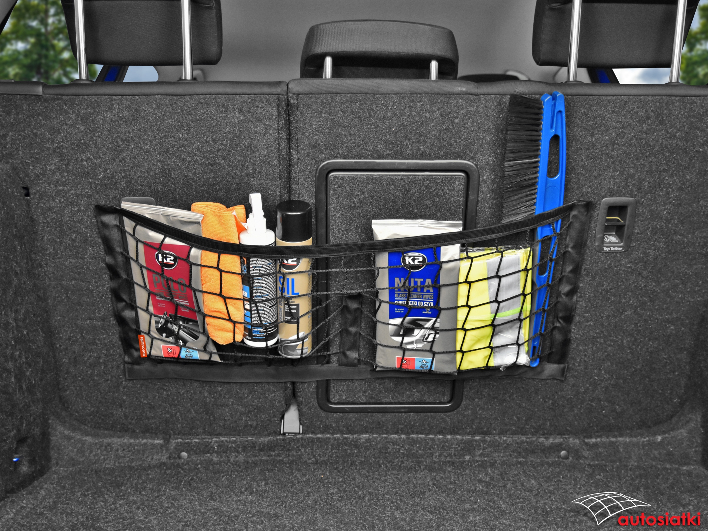 Это прочная сетка, покрытая лентой-липучкой внизу, по бокам и посередине. Прорезиненный верх для защиты аксессуаров от перемещения. Сетчатый разделитель позволяет разделить аксессуары. Карман крепится на коврик в багажнике или салоне автомобиля.