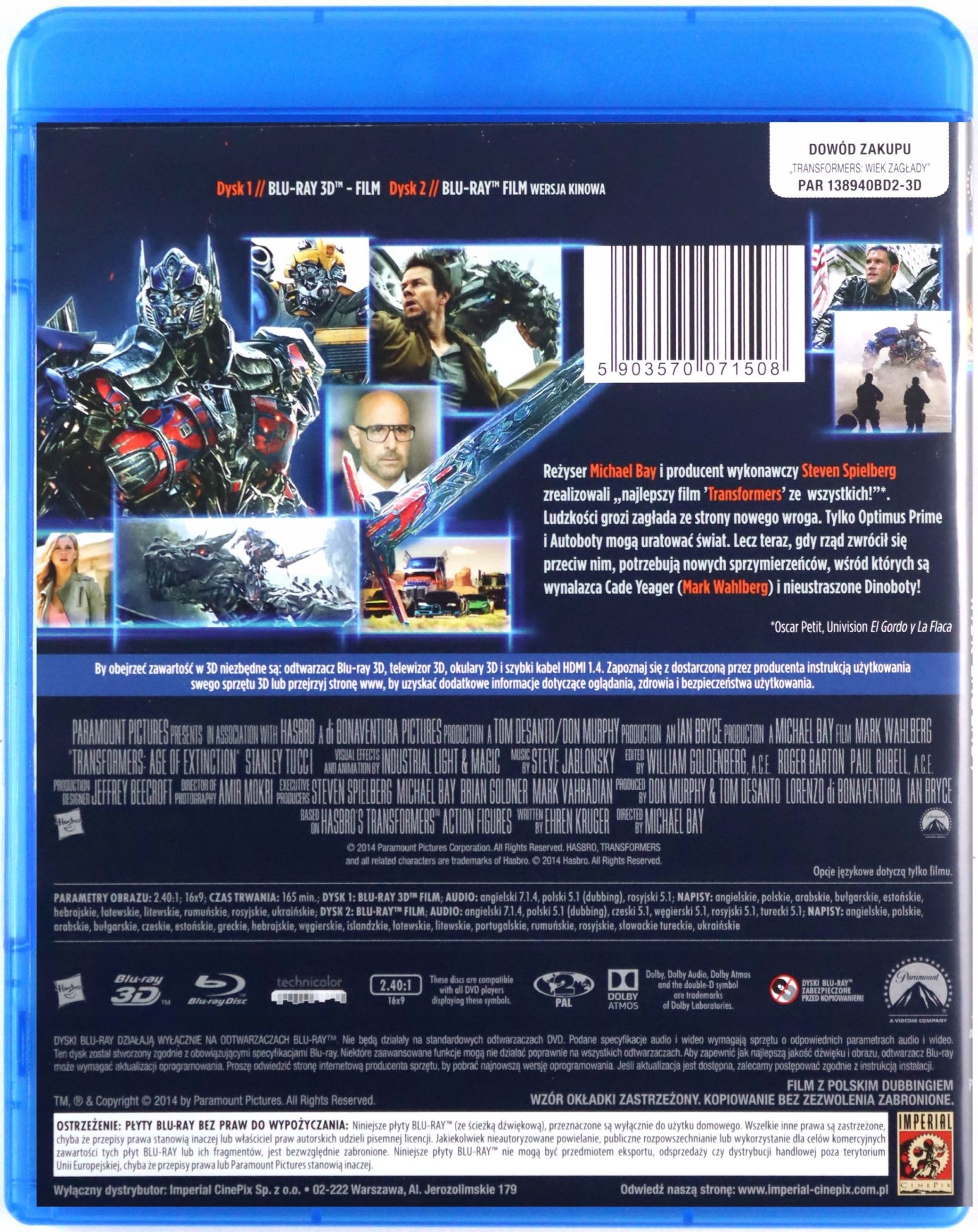Режиссер Майкл Бэй и исполнительный продюсер Стивен Спилберг сняли «лучший фильм о Трансформерах всех времен!» Человечеству грозит исчезновение из-за нового врага. Только Оптимус Прайм и автоботы могут спасти мир. Но теперь, когда правительство восстало против них, им нужны новые союзники, в том числе изобретатель Кейд Йегер (Марк Уолберг) и бесстрашные диноботы! более 3 часов дополнительных материалов диск 1 / BLU-RAY 3D - фильм диск 2 / BLU-RAY - кинокинотеатральная версия диск 3 / Бонусный диск BLU-RAY с эволюцией дополнительных материалов во время Холокоста - отчеты о производстве и многое другое!< /п>