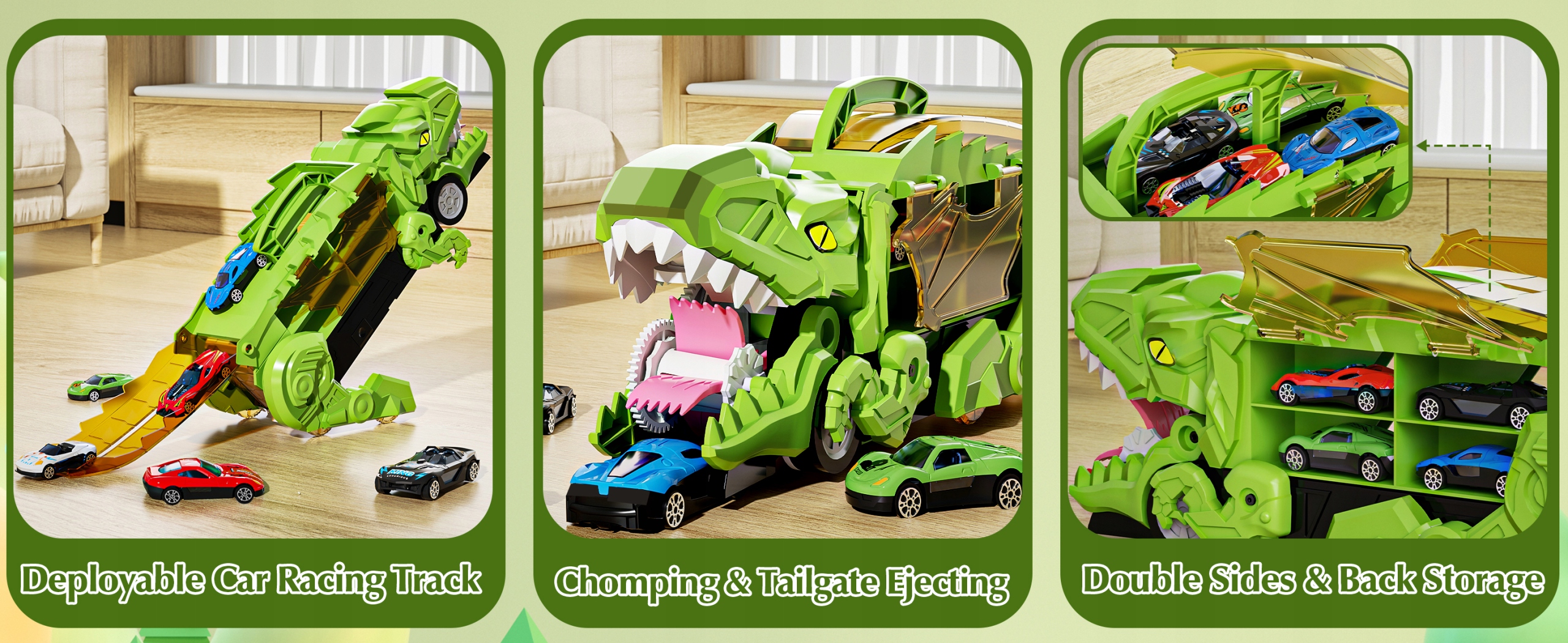 ✔ [Трансформация динозавров] Игрушки-динозавры-транспортеры бывают двух форм и могут легко трансформироваться из гигантского грузовика-монстра в созданного тираннозавра Рекса без сборочных приспособлений. Его функцией может быть двойной ряд пандусов, что позволит маленьким мальчикам и девочкам участвовать в захватывающих гонках, раскрывая свои творческие способности и воображение.
