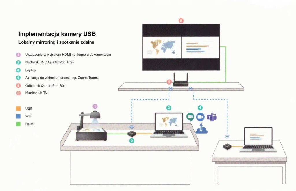QuattroPod T02+ — часть последней версии профессиональной системы беспроводной передачи аудио-видео сигнала. Он работает с ресиверами QuattroPod R01, обеспечивая все существующие функции системы QuattroPod и позволяет подключить дополнительную камеру HDMI – например, камеру для документов. В таком случае к передатчику T02+ можно подключить дополнительное устройство HDMI (подключаемое к компьютеру через порт USB), например, документ-камеру. В такой ситуации (также показано на рисунке ниже) контент с дополнительного HDMI-устройства (камеры) одновременно отправляется на монитор (через ресивер R01) и компьютер (через USB UVC).