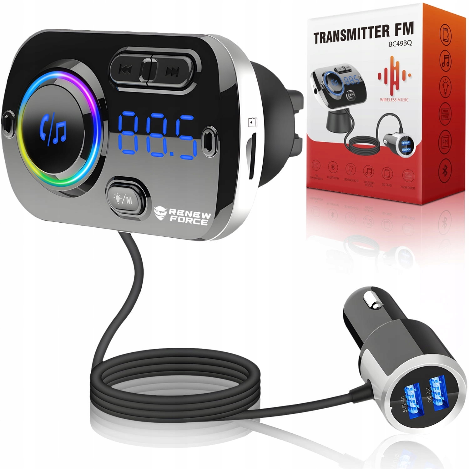 Вилка прикуривателя передатчика оснащена двумя USB-портами: первый, 5В 2,4А, позволяет заряжать стандартное устройство с USB-входом и является используется для чтения данных с устройств хранения. Второй вход — Quick Charge 3.0, благодаря которому мы можем быстро зарядить любой телефон, гарнитуру или любое другое устройство!