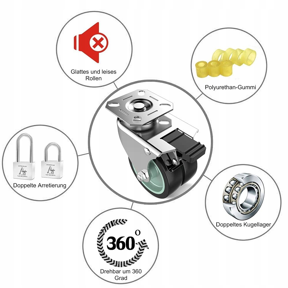 HomeGoGo Набор из 4 поворотных роликов с предохранительным замком. Двойные ролики диаметром 50 мм. Тихие, прочные мебельные ролики с термопластичной резиной для домашнего использования. Поворот на 360°, 400 кг.
