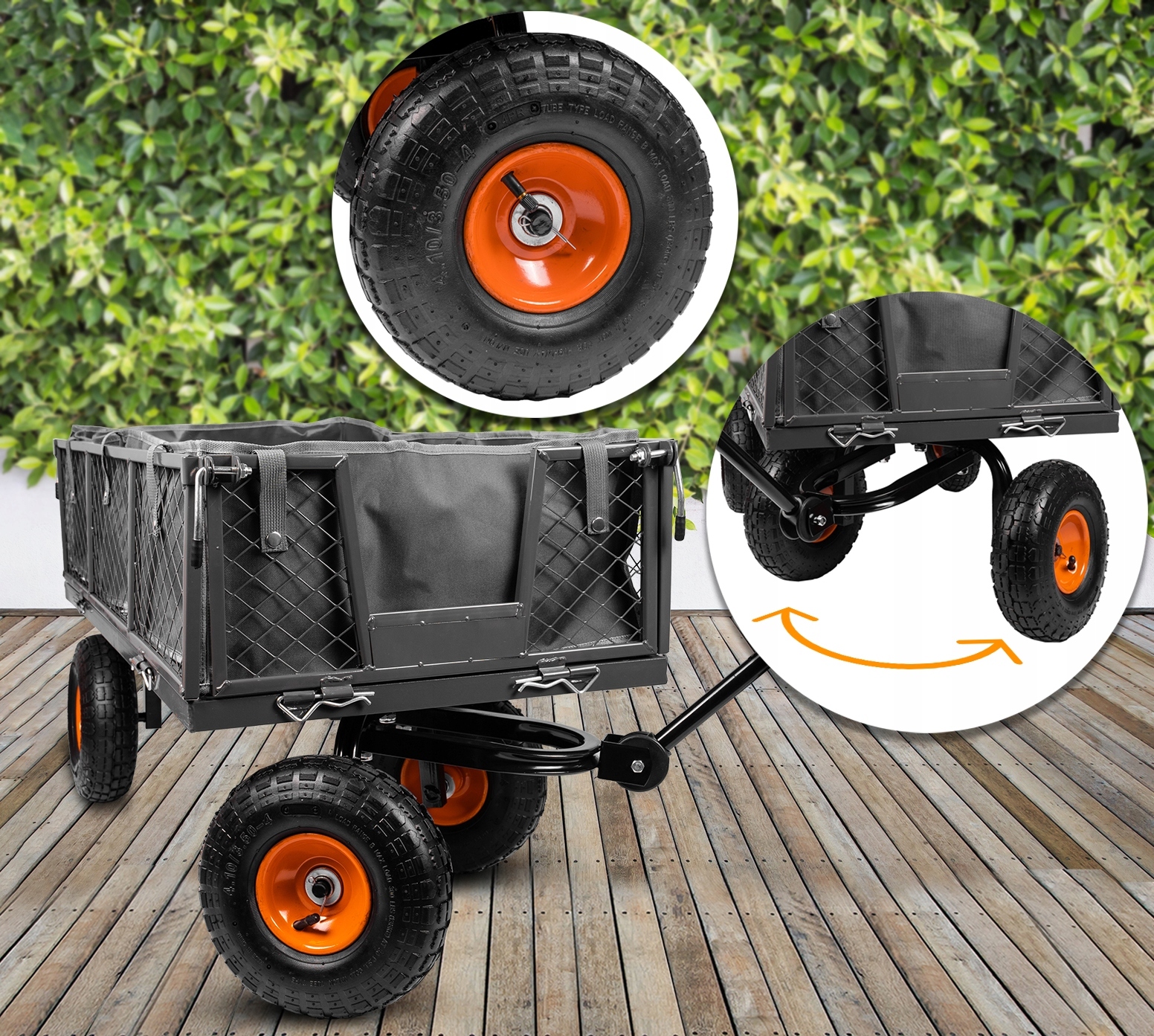 Трейлер был прочным, что обеспечивает его долгую жизнь и силу для жестких условий. Конструкция была окрашена в порошок метода. Это идеальный инструмент для людей, которые нуждаются в транспортировке различных предметов в саду или на участке, без необходимости подвергать себя травмам или усталости.