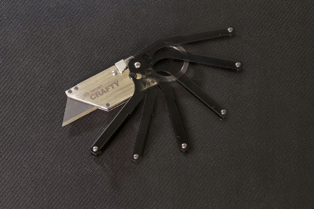 Crafty — это личный канцелярский нож, который можно прикрепить к чему угодно. Имеет складную защиту лезвия, которая становится ручкой, и быстросъемный карабин, который также служит надежным отверстием для пальца. Кроме того, встроенный пружинный зажим позволяет легко прикрепить его к одежде, сумке или брелоку.