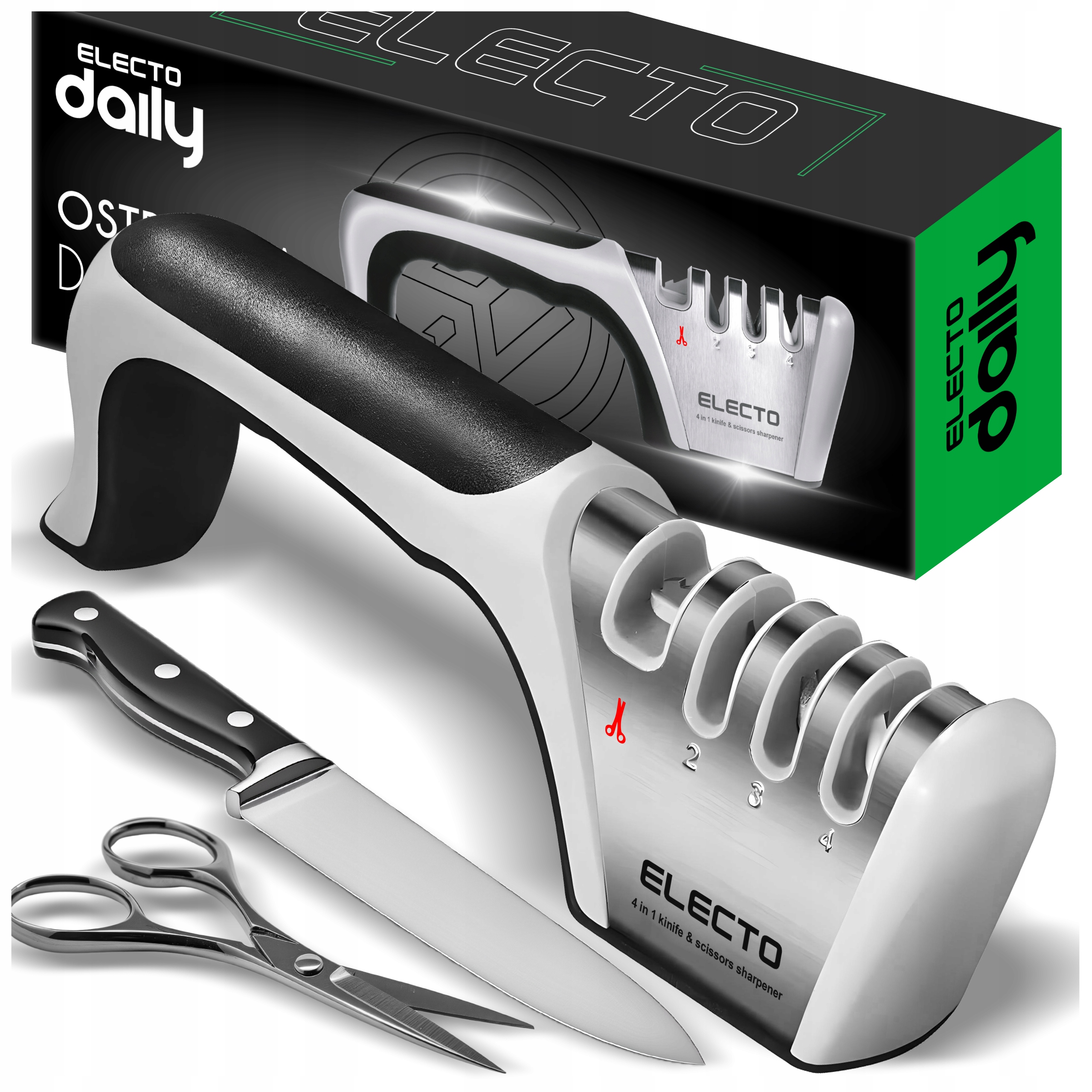 - Точилка Electo 4 в 1 за несколько мгновений восстановит остроту ножей и ножниц.