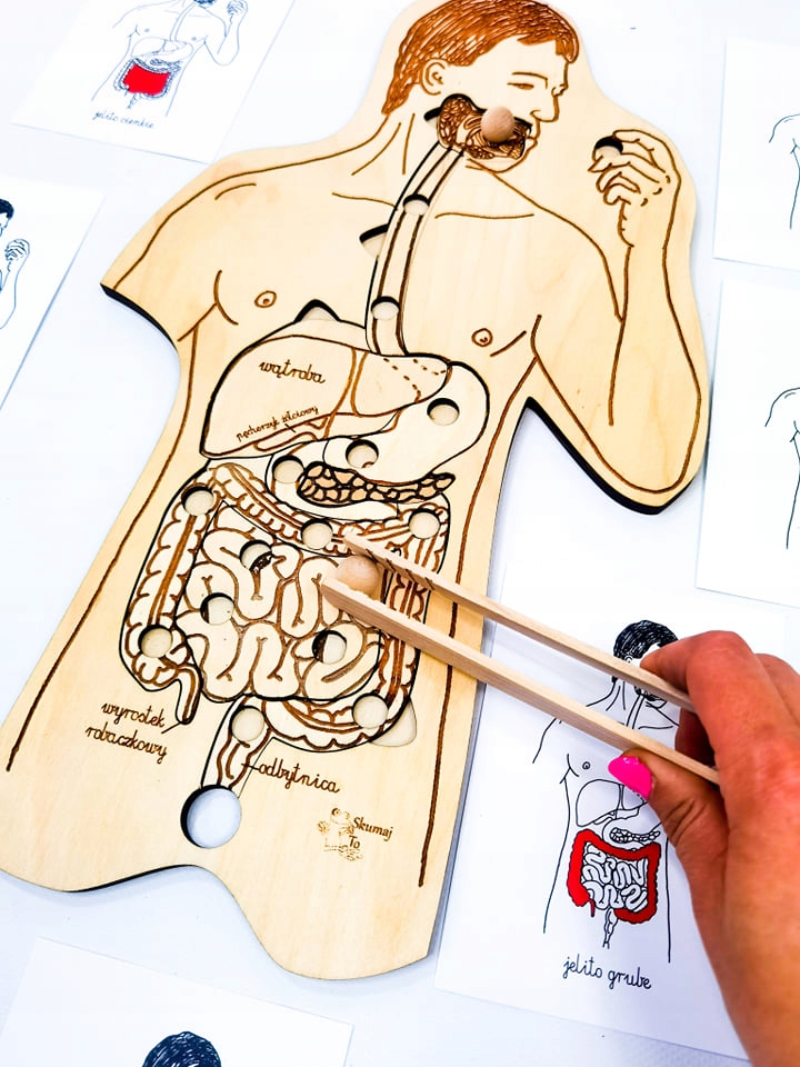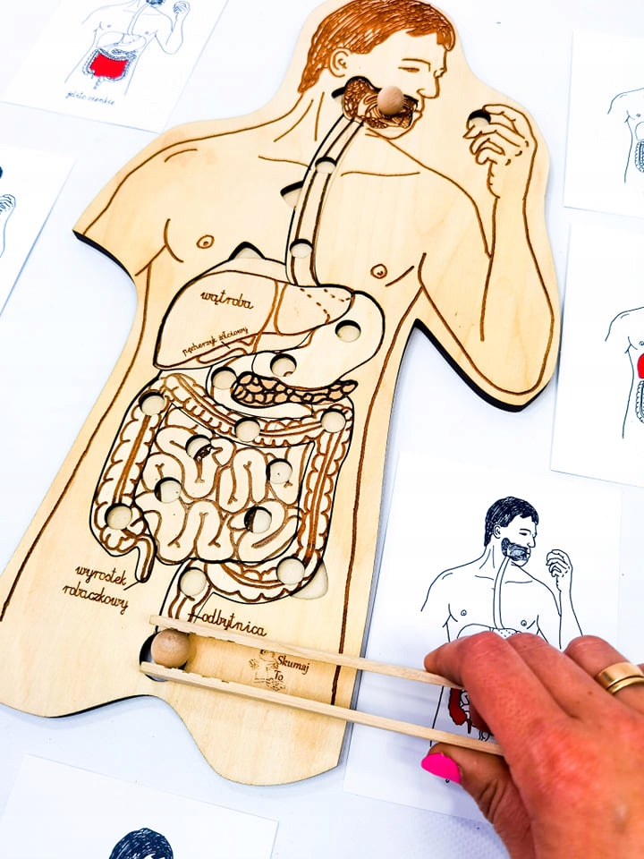 Набор состоит из базы с размерами 265x466x10 мм и движущимися элементами для укладки пищеварительной системы человека. В каждом эпизоде отверстия вырезаны так, чтобы ребенок мог использовать плоскогубцы, чтобы перемещать саму пищу (мяч) на отдельных органах. В конце пищеварительной системы у нас есть отверстие, через которое падает мяч- да, это первая деревянная головоломка, которая заставляет корма!