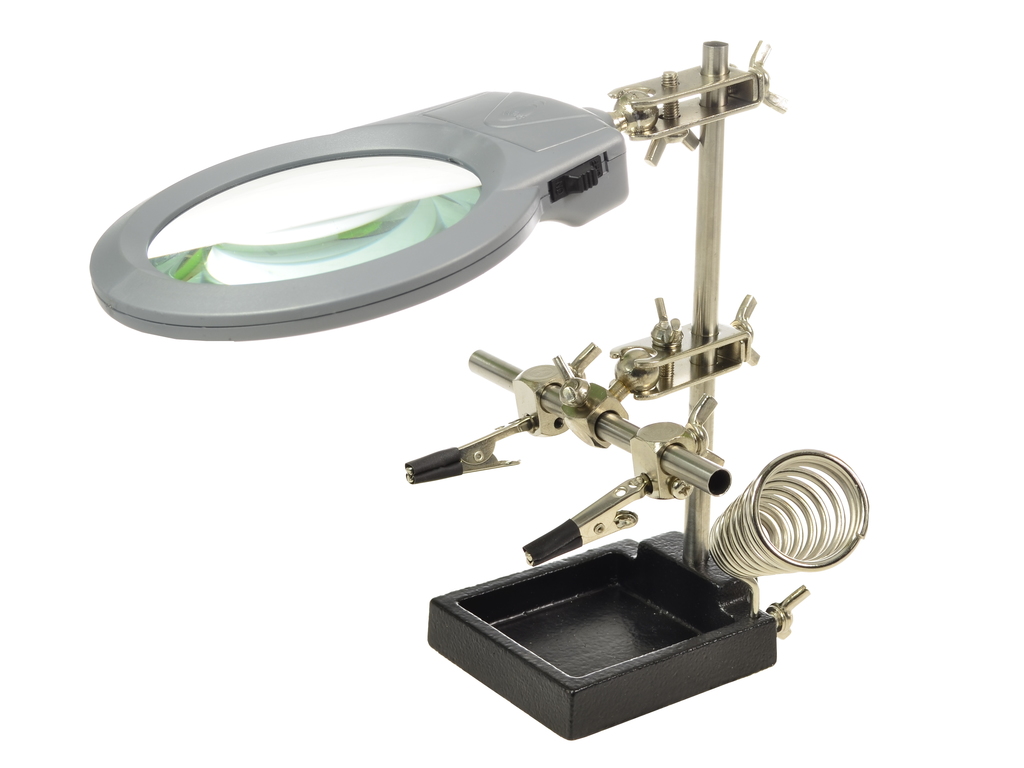 От третьего лица, монтажный держатель с увеличительным стеклом 2x90 мм, светодиодной подсветкой и спиральным держателем для паяльника