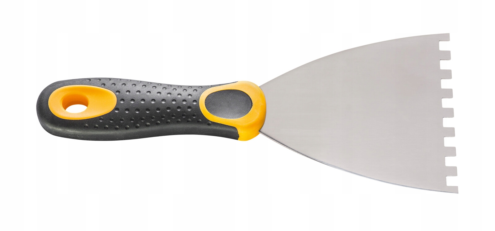 Spacula изготовлен из полированной нержавеющей стали, устойчивой к коррозии и действию строительной химии. , покрытый слоем резины, гарантирует определенную сцепление и комфорт работы.
