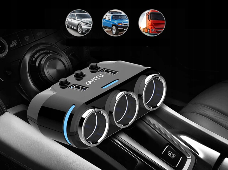 Разветвитель на три сигареты розетки прикуривателя с цифровым вольтметром, отображающим текущий уровень напряжения аккумулятора, и два USB-порта для быстрой зарядки. Комплект позволяет использовать все розетки одновременно, т.е. заряжать напр. навигация и телефон одновременно. Каждое гнездо прикуривателя имеет отдельный выключатель и подсвечивается синими светодиодами. Распределитель оснащен защитой от короткого замыкания, перегрева и защитой от слишком высокого напряжения.