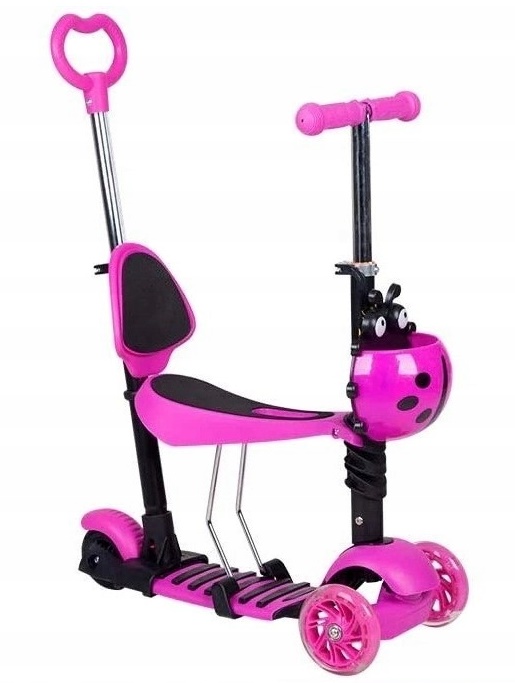 ПУШЕР - предполагает использование всех компонентов самоката (сиденье, спинка, ручка и корзина - божья коровка, прикрепленная спереди) - родитель толкает сидящего на сиденье ребенка за ручку.