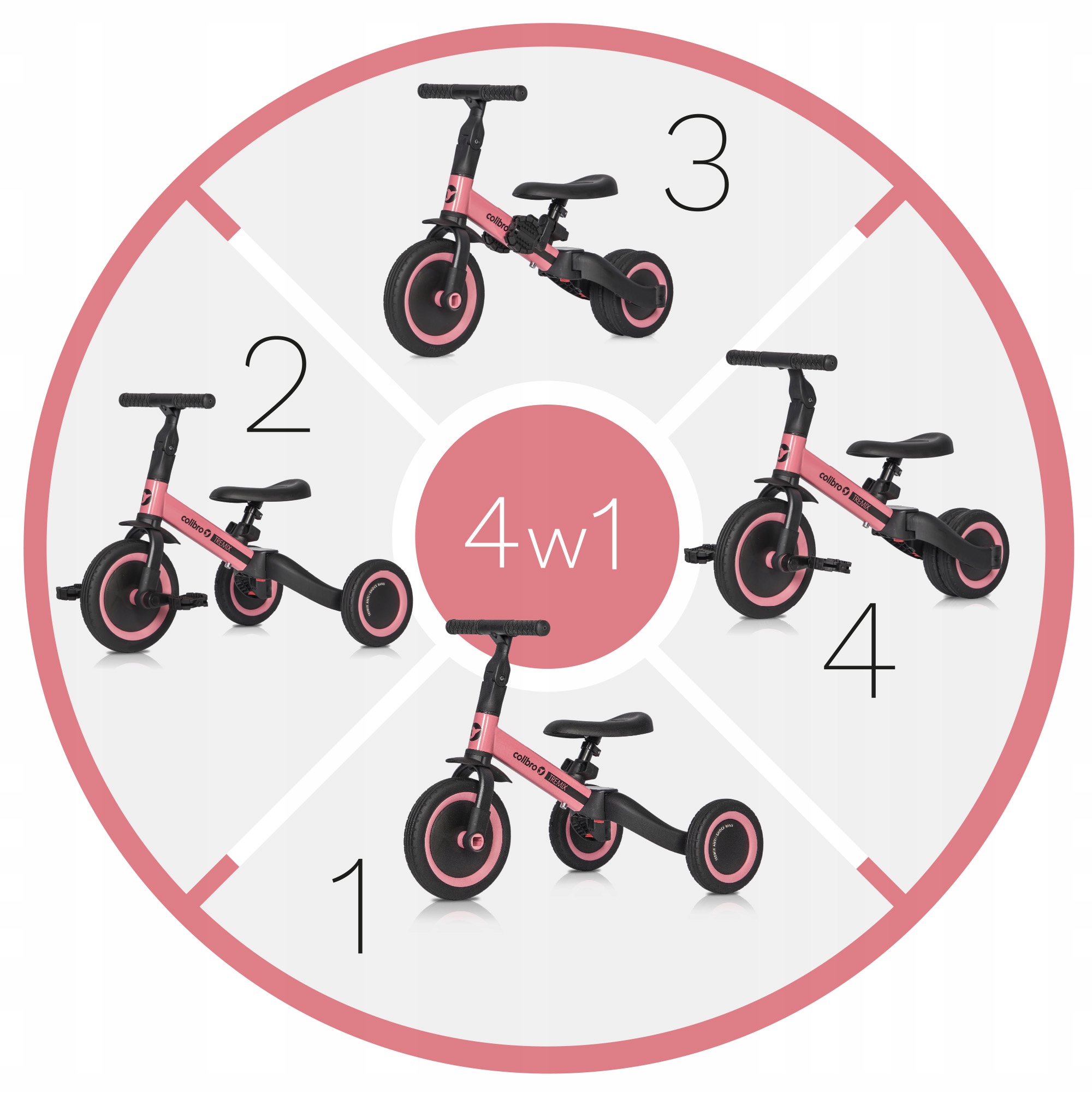 - Варианты велосипеда: 4 в 1, трехколесный (ребенок от 1 до 2 лет), трехколесный велосипед (от 2 до 3 лет), беговел (от 3 до 4 лет) лет), трехколесный велосипед, двухколесный велосипед