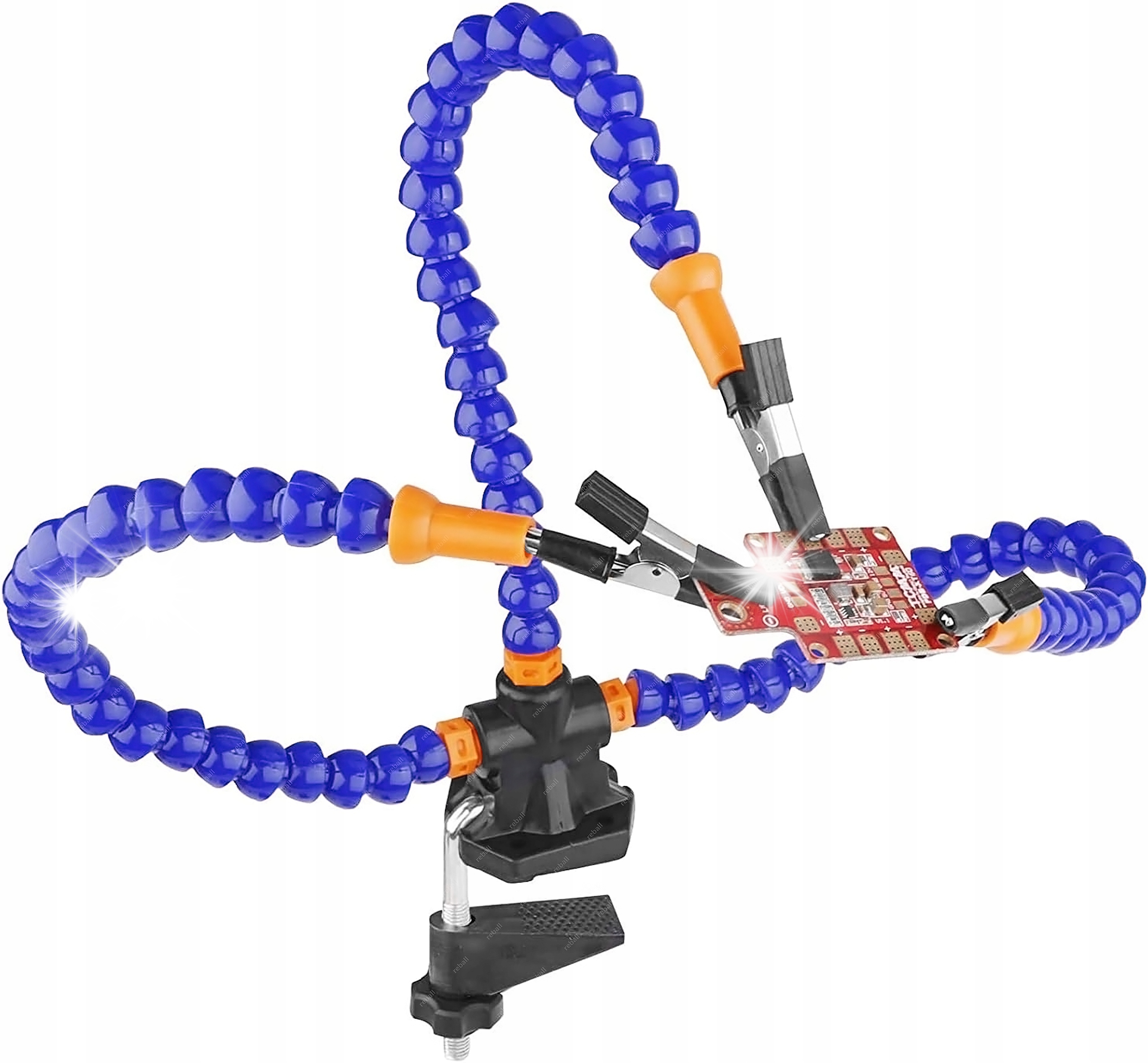 Третья рука оснащена тремя гибкими рычагами, которые позволяют стабильно и точно размещать элементы при пайке или других работах с мелкими элементами.