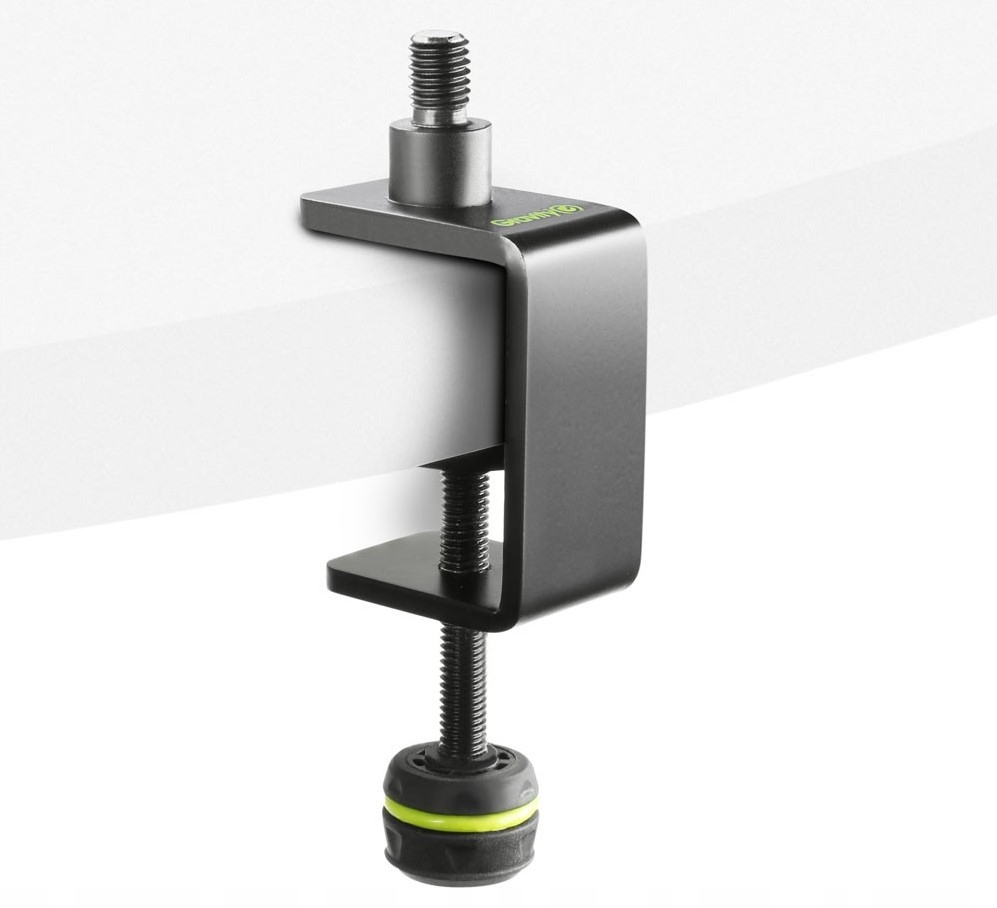 MSTM 1 B подходит для столов и настольных компьютеров максимальной толщиной 45 мм. Он изготовлен из стали толщиной 4 мм и имеет резьбу 3/8 дюйма для крепления микрофонных зажимов или держателей на гибкой шее. Пластиковый наконечник регулировочного винта защищает от царапин.