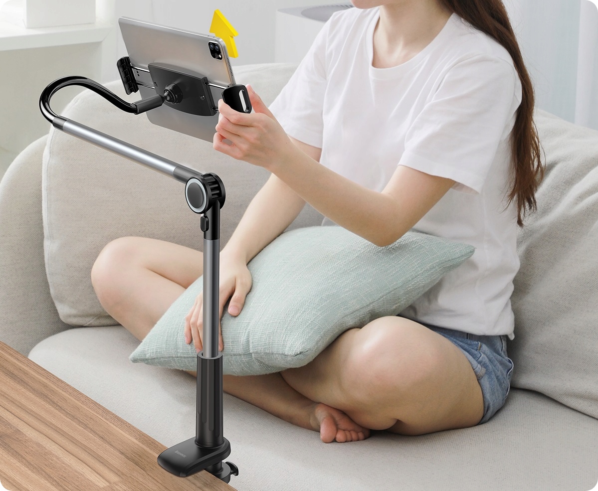 - Работа и учеба: Возможность крепления держателя на столе делает его идеальным решением для удаленной работы, участия в видеоконференциях, чтения документов или просмотра заметок, не отрывая рук.