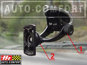 - с помощью винт (2) закреплен на задней стороне монтажной пластины с помощью крючков, можно менять положение головки по вертикали (вверх-вниз) или по горизонтали (вправо-влево) - максимальный наклон до 60 градусов в каждую сторону. С помощью этого же винта можно плавно менять положение головы с устройством из вертикального в горизонтальное без необходимости демонтажа ручки (особенно полезно при использовании спутниковой навигации в горизонтальном режиме).