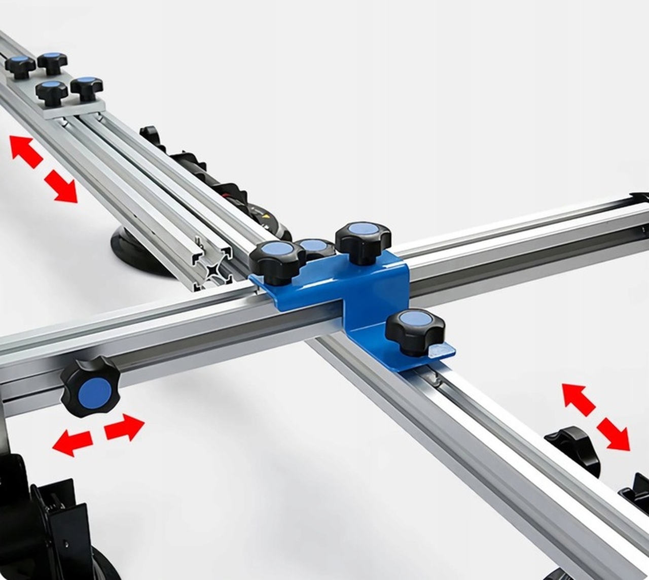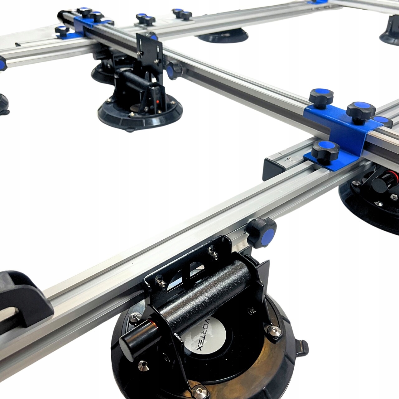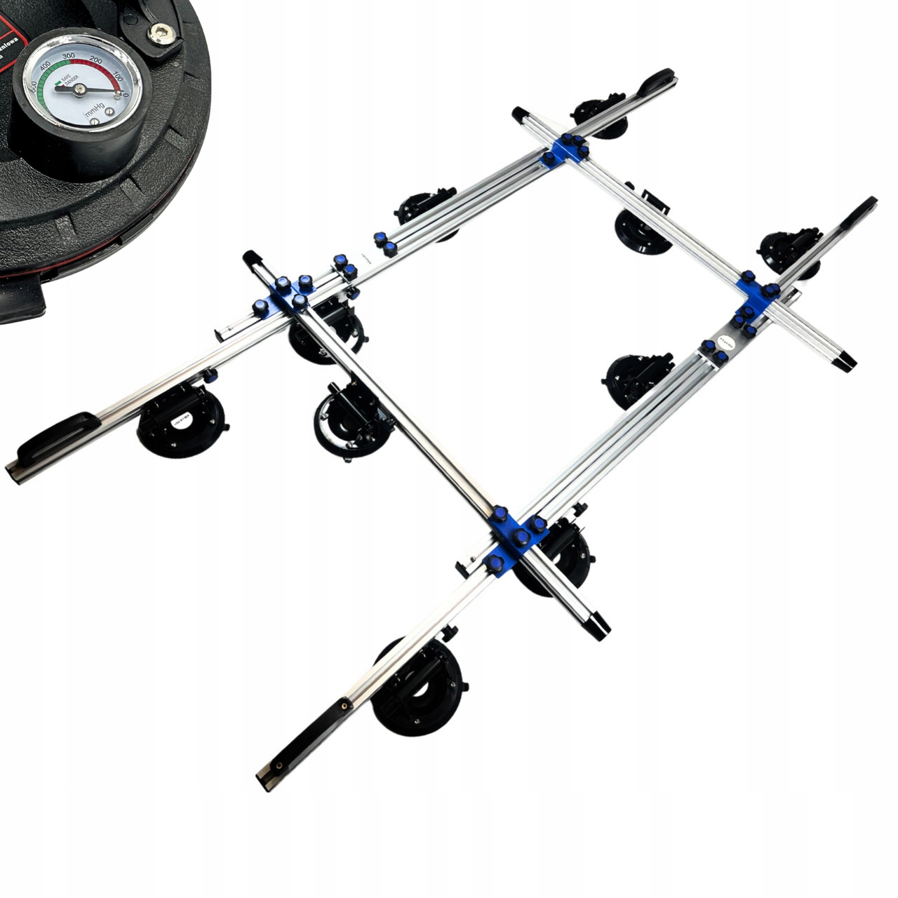 Алюминиевый каркас системы состоит из двух пар раздвижных профилей очень прочной конструкции и еще двух алюминиевых поперечных профилей. На раме установлены 10 вакуумных присосок, и всю конструкцию можно свободно регулировать. Все присоски можно перемещать по алюминиевым направляющим по мере необходимости. Благодаря манометрам на каждой присоске легко проверить текущее давление присосок.