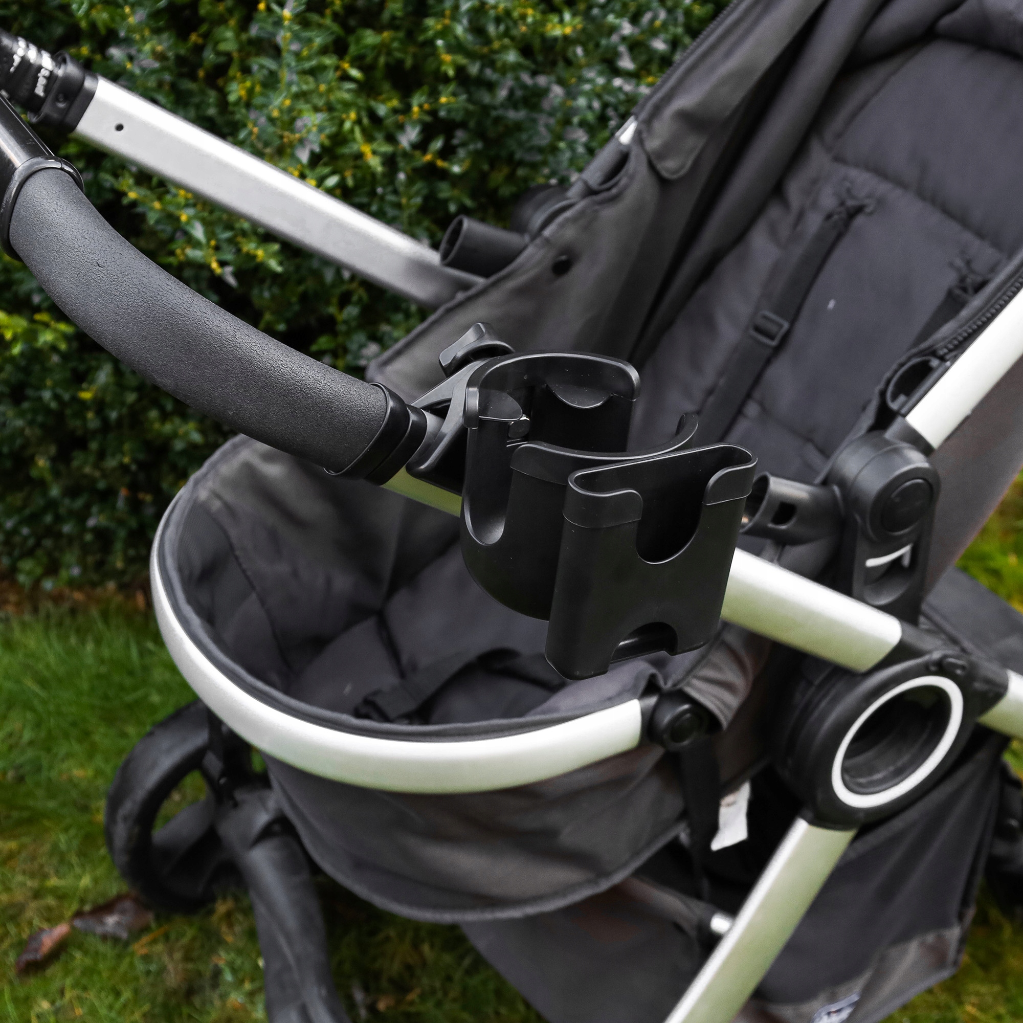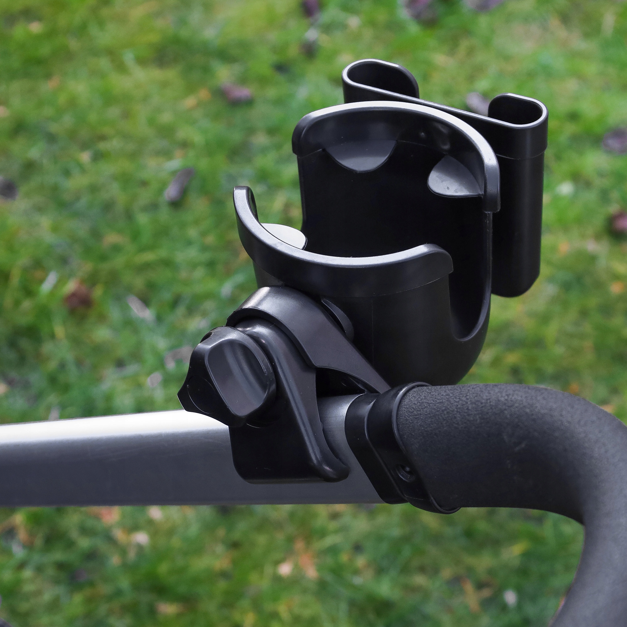 Надежный держатель для чашки, телефона, бутылки, который можно прикрепить к раме коляски. Ручка крепится к раме коляски с помощью регулируемой ручки, что позволяет подогнать ее под разную толщину рамы коляски.