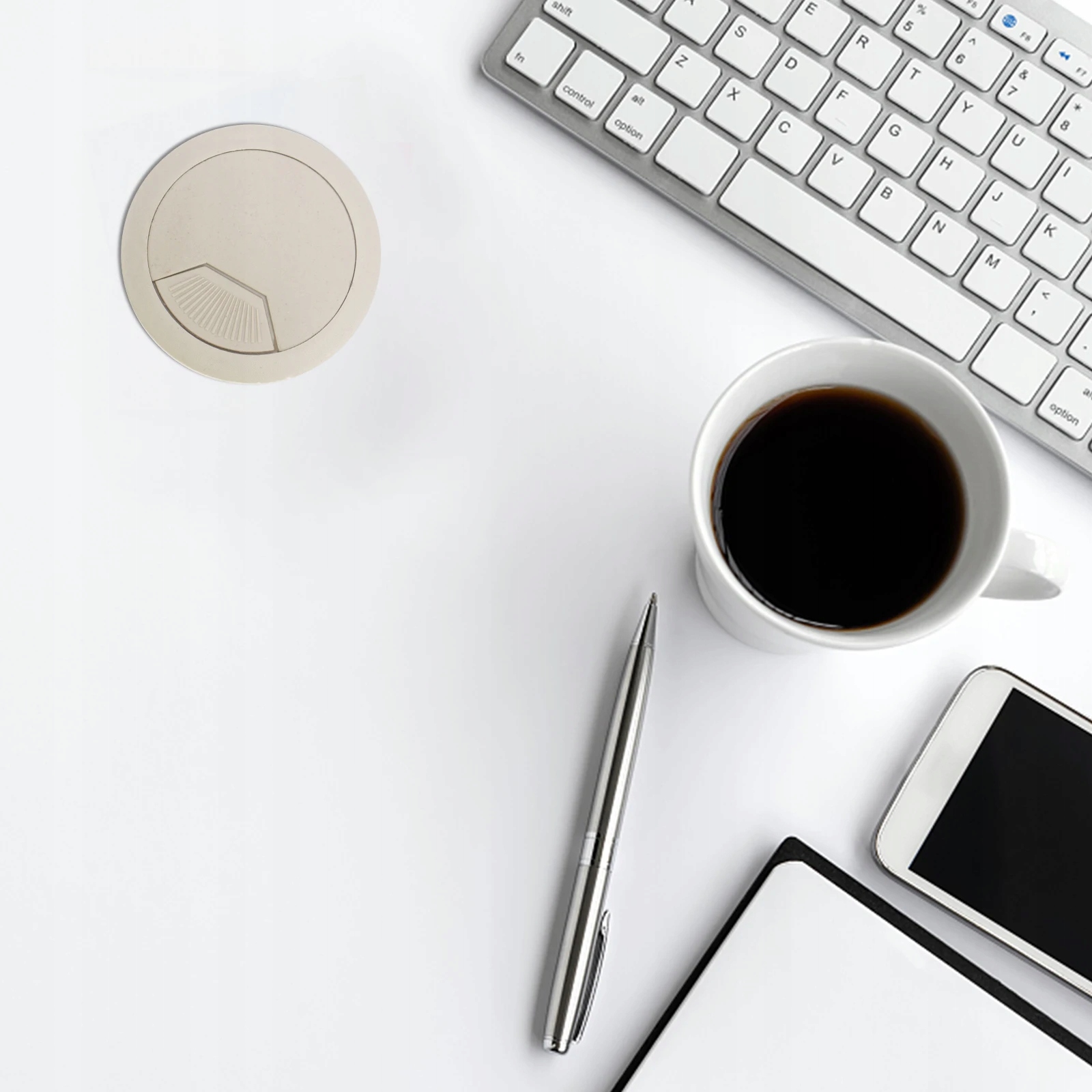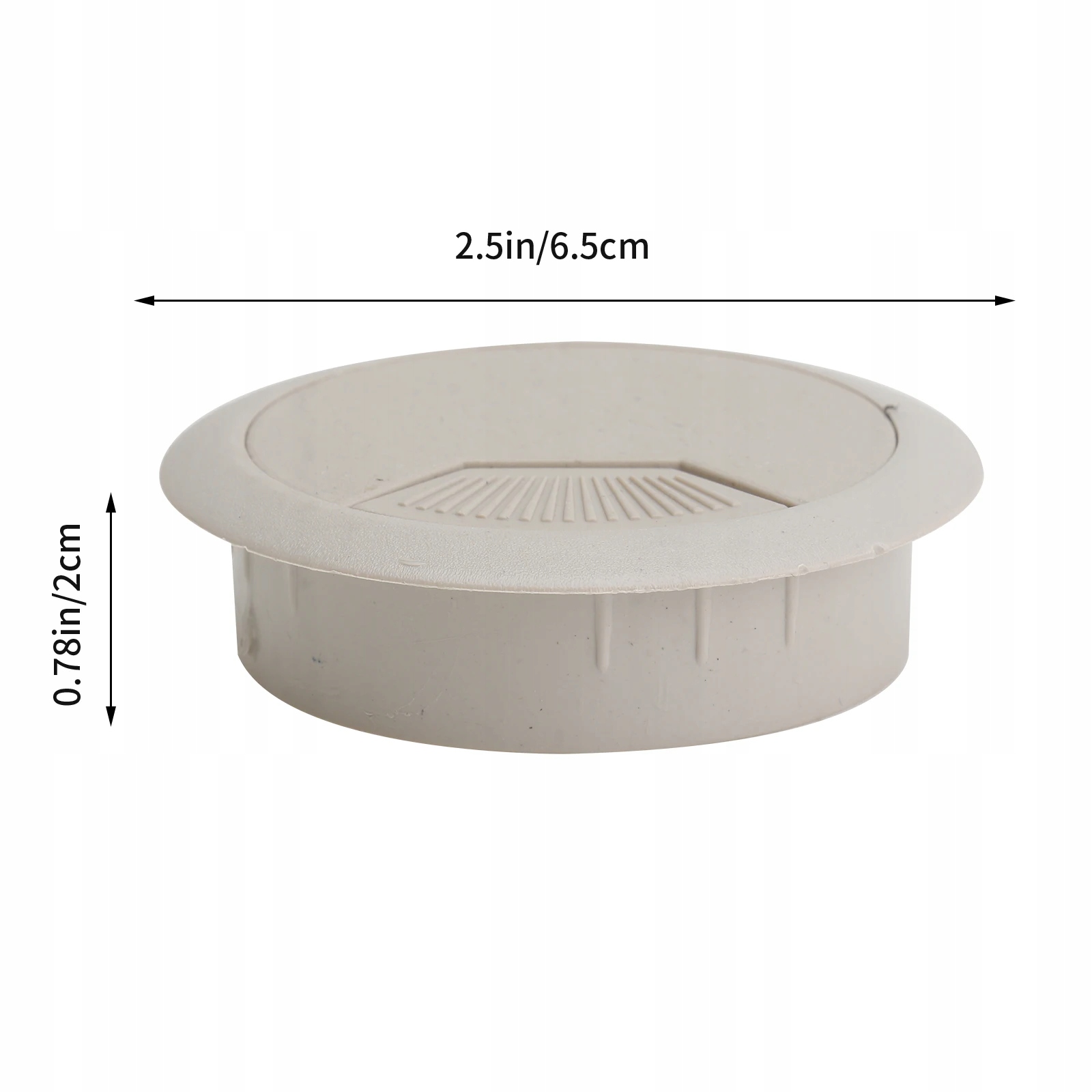 Изделие представляет собой круглую крышку кабельного отверстия из пластика, подходящую для просверленного отверстия диаметром 53 мм. Подходит для компьютерного кабеля большего размера. Аксессуар для установки кабеля на компьютерном столе и широко используется в офисе, доме, гостинице, банке и т. д.