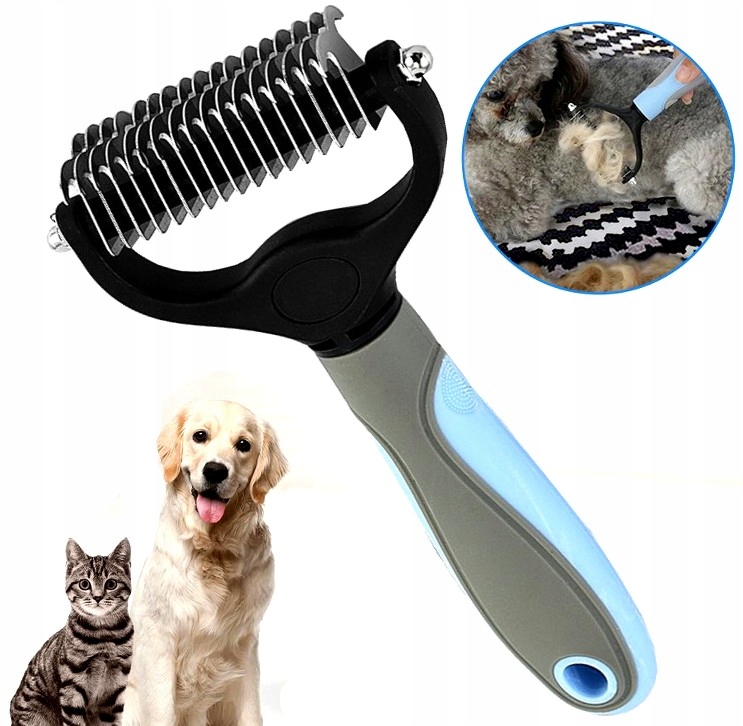 Расческа имеет двусторонние изогнутые лезвия, которые безопасно удаляют подшерсток, колтуны и запутанную шерсть собаки.
