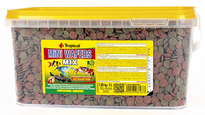 Красные пластины являются источником естественного астаксантина и бета-глюкана-сильный иммуностимулятор, который повышает устойчивость рыбы к заболеваниям. Зеленые пластины содержат спирулину и волокно, которые регулируют пищеварение. Вафры характеризуются высокими гидростатируемыми впитывающими водой, сохраняют свою структуру и не разваливаются, что облегчает кормление ракообразных и позволяет естественное кормление рыбы, чья мундштук превращается в всасывающую чашку, оборудованную зубами, используется для истирания пищи из твердых поверхностей.