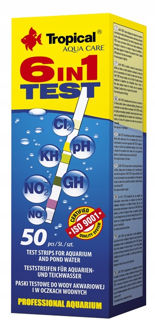 Тест-полоски TROPICAL 6 IN 1 для аквариумной воды и прудов. ТЕСТ ТРОПИЧЕСКИЙ 6 В 1 предназначен для измерения концентрации нитратов. и нитриты, общая и карбонатная жесткость, pH и концентрация общего хлора в пресной воде. Он безопасен, нетоксичен и прост в использовании – достаточно окунуть полоску в тестируемую воду и через некоторое время считать значения шести химических параметров. Быстро полученная информация о химических параметрах воды позволяет при необходимости незамедлительно принять меры по улучшению условий жизни рыб.