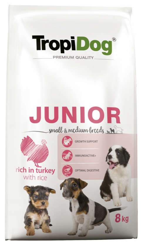 TropiDog Premium Junior S/M Turkey & Rice 8kg +GRATIS