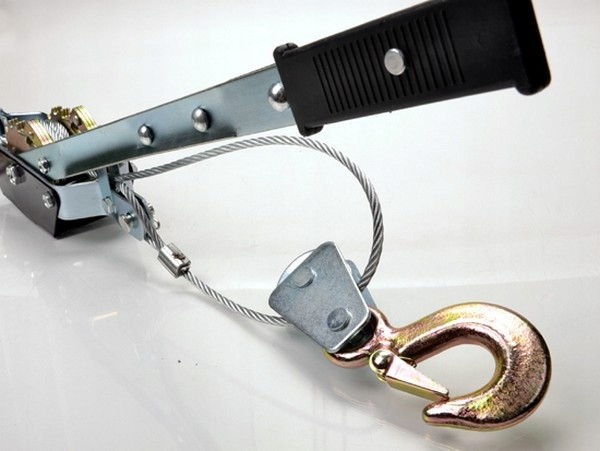 Тросовая лебедка с ручным приводом используется для транспортировки грузов в горизонтальной плоскости. Он состоит из стального троса и рычага, приводящего в движение барабан с храповым механизмом. Его конструкция не позволяет поднимать груз, он оптимизирован для протягивания массы по горизонтальной плоскости.