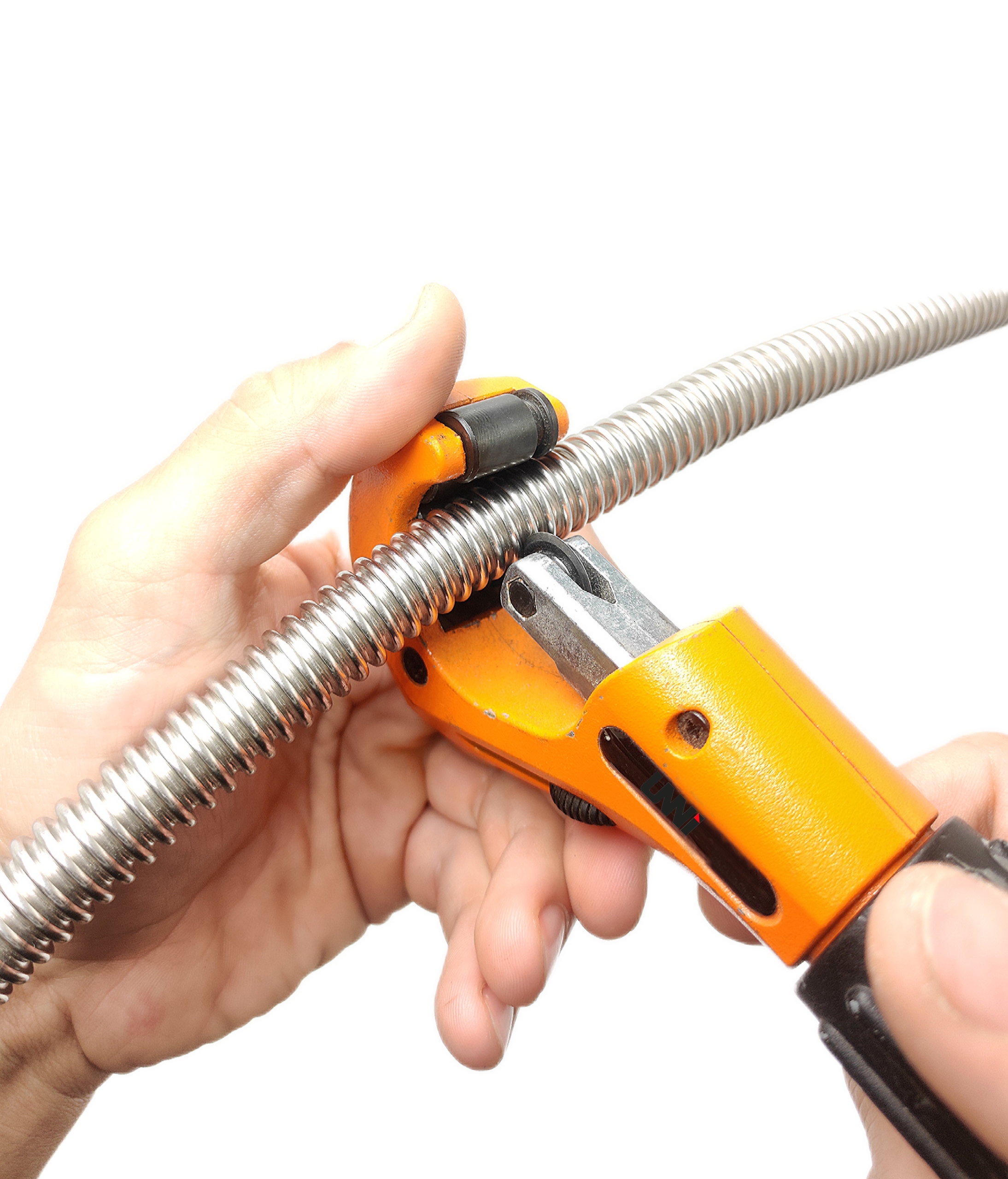 Вся система проста в использовании даже новичкам. Для герметичного соединения необходимо перерезать трос из нержавеющей стали и запрессовать разъем на конце шланга. Подготовленный таким образом трос можно согнуть под необходимым углом, а затем затянуть предварительно запрессованной поворотной гайкой. Возможно изготовление неразъёмного - приварного конца трубы
