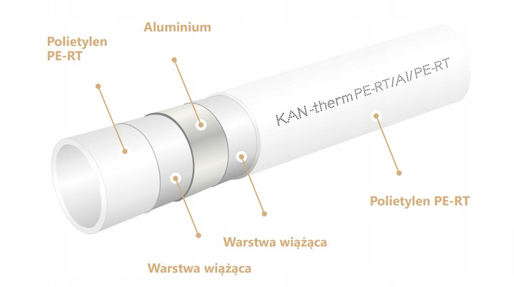 Многослойные трубы KAN-therm UltraLine AL (диаметрами 14-32 мм) состоят из следующих слоев: внутренний слой (основная труба) из полиэтилена с повышенной термостойкостью PE-RT, средний слой в виде алюминиевого слоя. Лента сварена ультразвуком встык и внешний слой (покрытие) выполнен из полиэтилена PE-RT. Между алюминиевым и пластиковым слоями имеется клеевой слой, который прочно соединяет металл с пластиком.