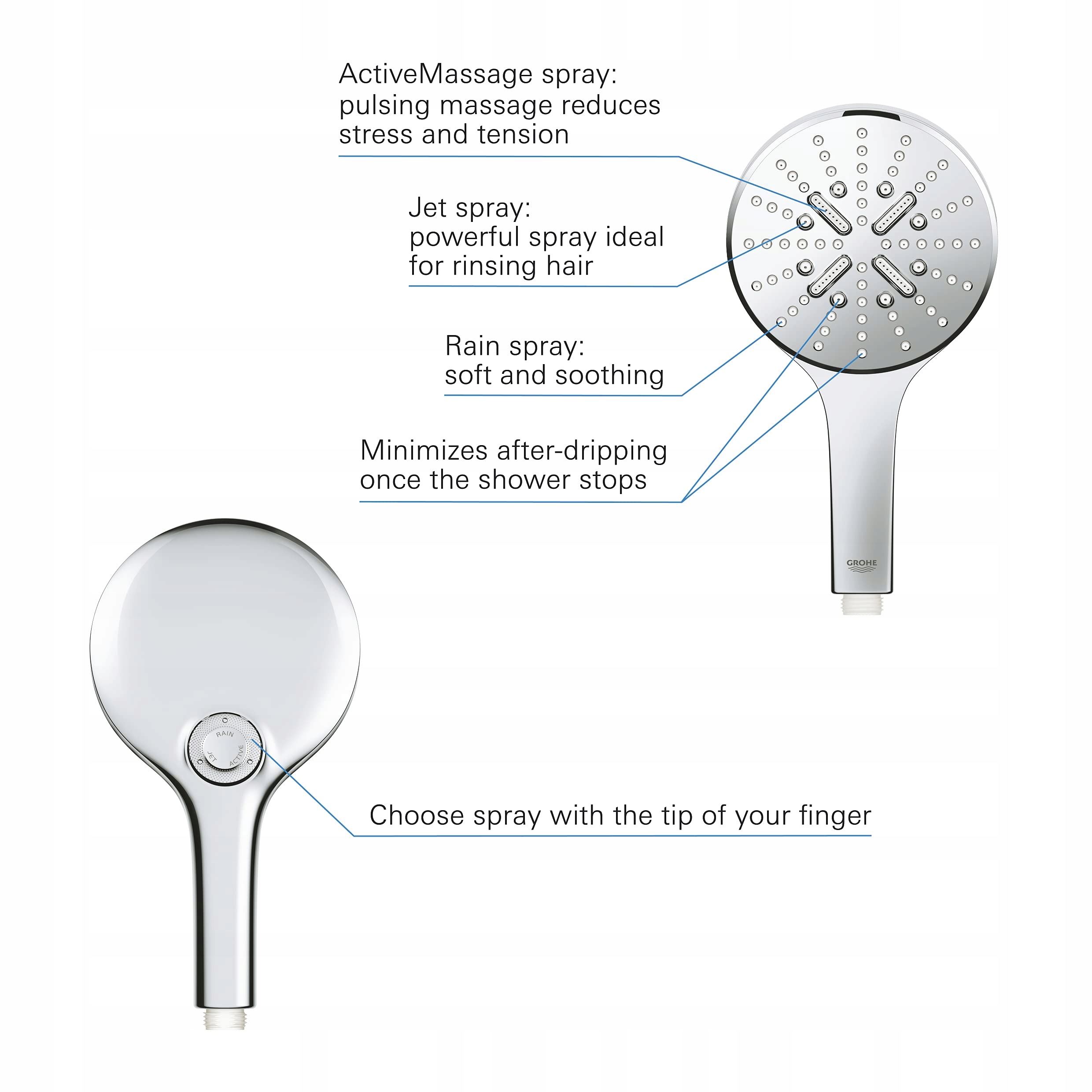 - GROHE Rain с DripStop, Jet с DripStop, ActiveRain и Grohe DreamSpray — идеальная струя.