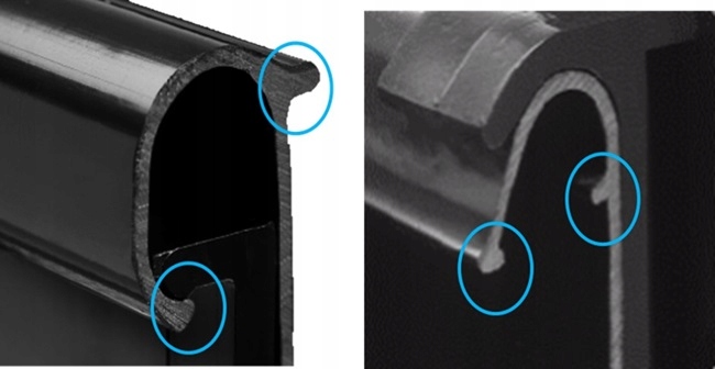 Наружный и внутренний фланец желоба выбраны не случайно. Они усиливают профиль в четыре раза. 4 выступа/носика, идущие по всей длине желоба, значительно придают ему жесткость, удерживают ровное и вертикальное положение и предотвращают деформацию. б > под нагрузкой снега или льда.