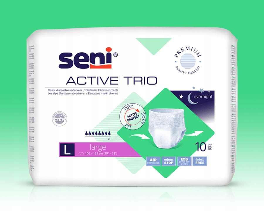 Это последний уровень впитываемости впитывающих трусиков Seni Active. Впитывающие трусики Seni Active Trio рекомендуются для ночного ношения при тяжелом недержании мочи, а также людям, у которых очень сильно выделяется моча или которые не ходят в туалет или пользуются им редко.
