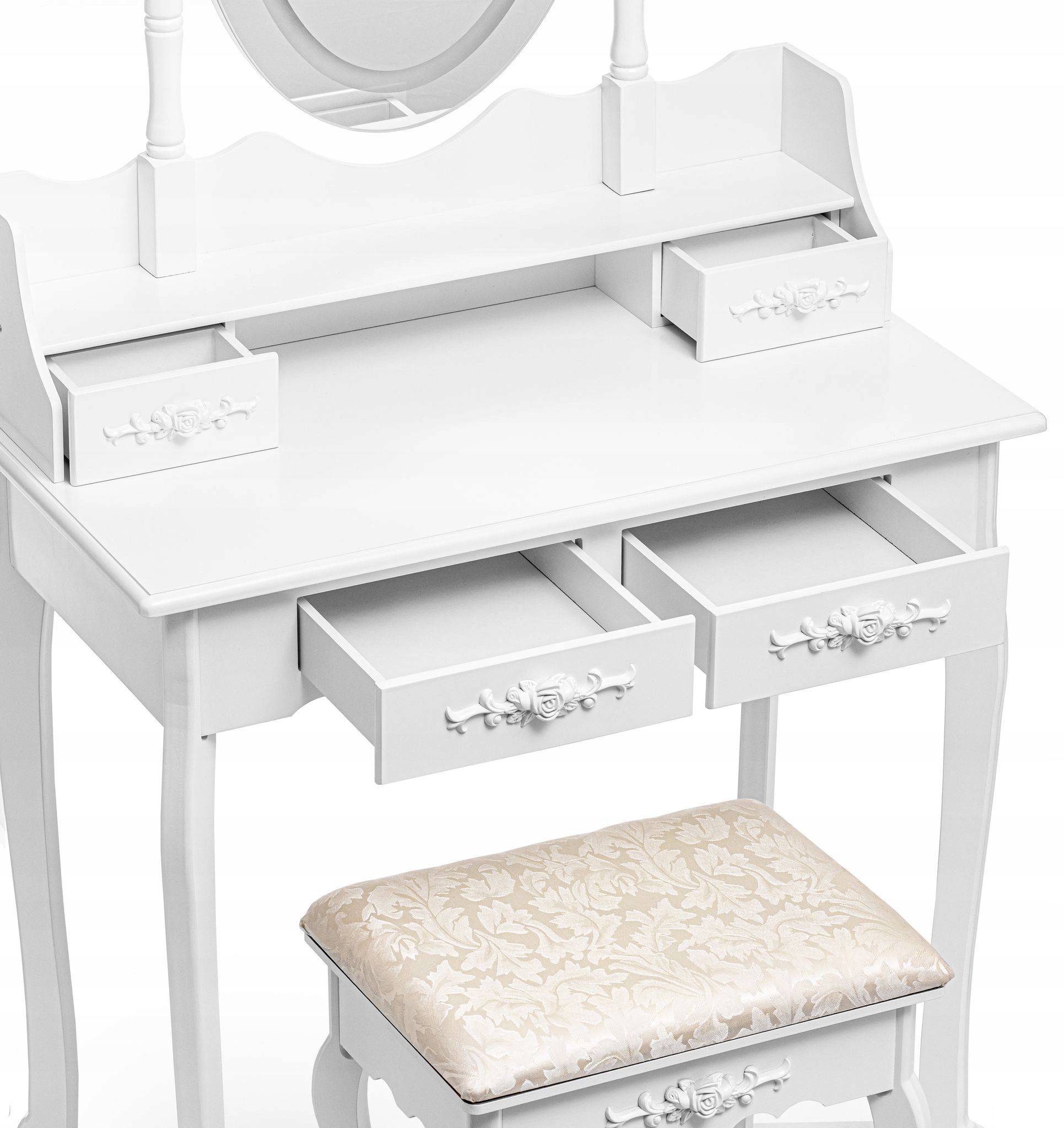 - В комплект также входит удобный табурет. Когда он не используется, его можно легко задвинуть под туалетный столик, что позволяет сэкономить место, не жертвуя комфортом.