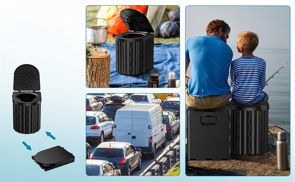 Многофункциональный и широко применимый: Многофункциональный дизайн позволяет свободно переключать различные режимы использования, это очень практично. Его можно использовать не только в качестве портативного походного туалета, но и в качестве мусорного бака, табурета, ведра для рвоты и т. д. для удовлетворения различных потребностей во время активного отдыха.