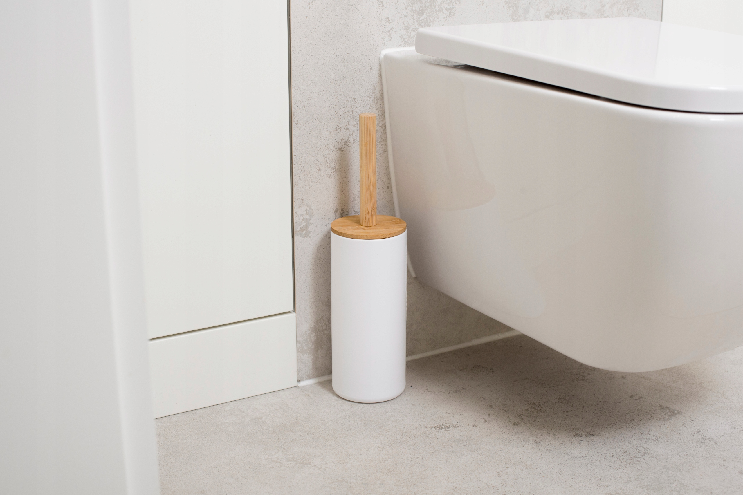 Практичный ершик с элементами из натурального бамбука. Ершик для унитаза изготовлен из высококачественного пластика, окрашенного в белый (матовый) цвет. Верхняя часть ёршика и крышка декорированы элементом из натурального бамбукового дерева, устойчивого к влаге. Внутри контейнера для щетки находится крышка/меньший по размеру съемный контейнер для капающей воды, который сохраняет контейнер для щетки сухим и чистым внутри.