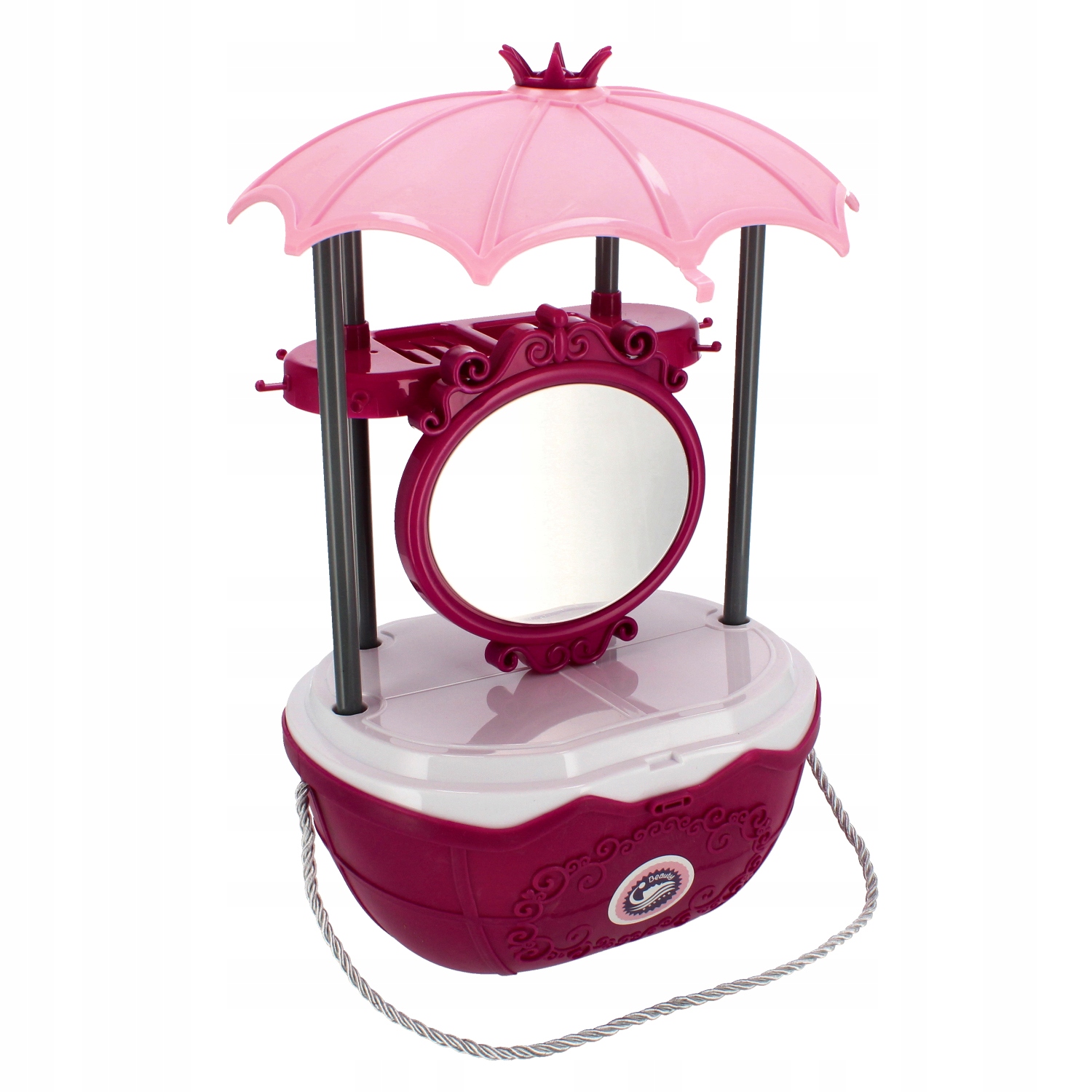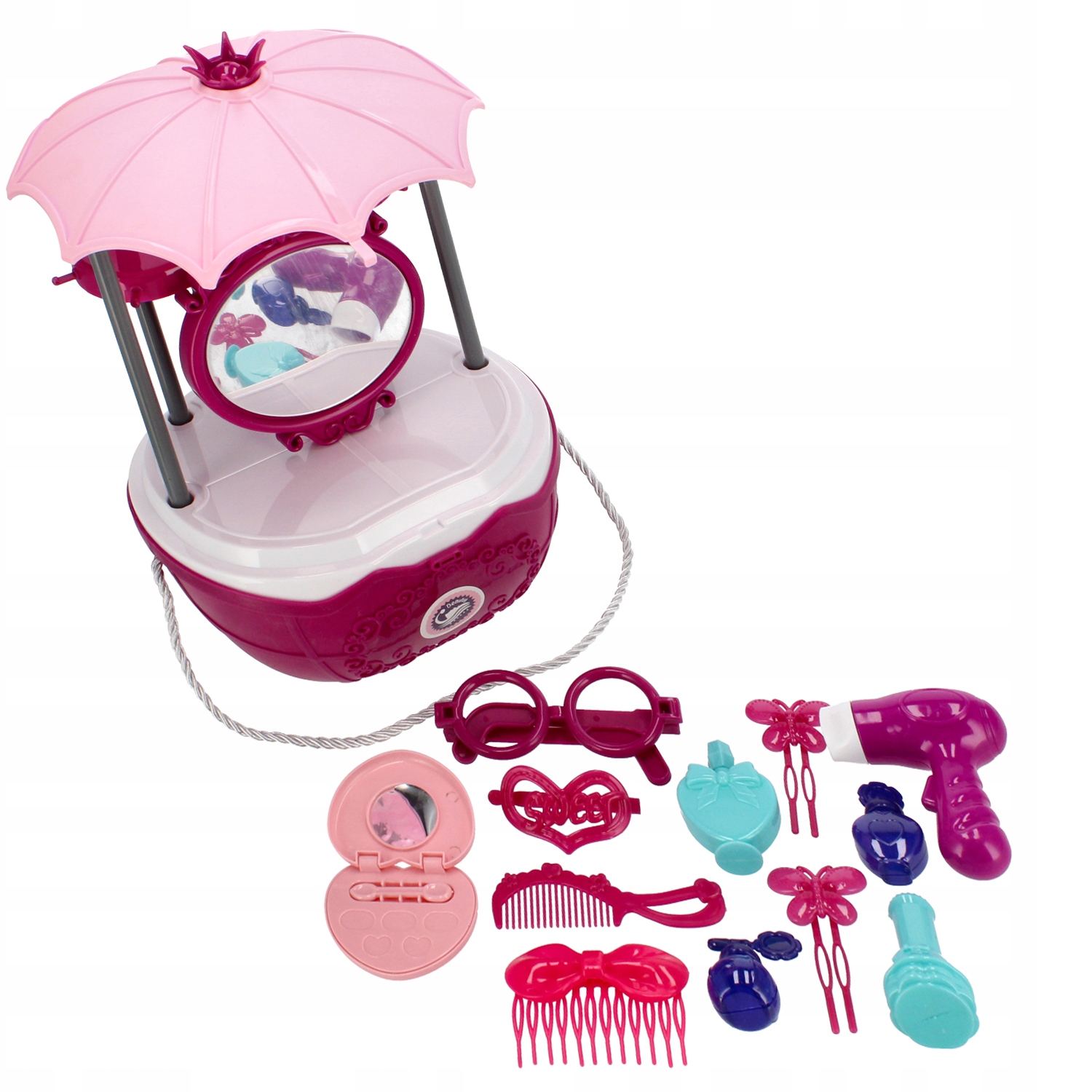 В комплект входят: туалетный столик с козырьком, зеркало, очки, 3 зажима, тени для век, 2 флакона духов, расческа, фен, зажим с расческой.