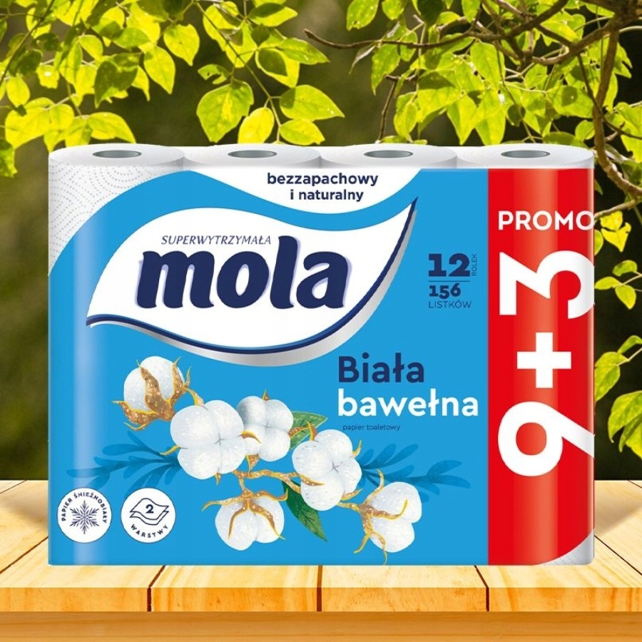 Mola Biała Bawełna — эффективная, но нежная и мягкая туалетная бумага. Два прочных слоя обеспечат вашей семье комфорт и удобство каждый день. В каждом рулоне целых 156 белоснежных листов бумаги без запаха, которых хватит надолго ⏲