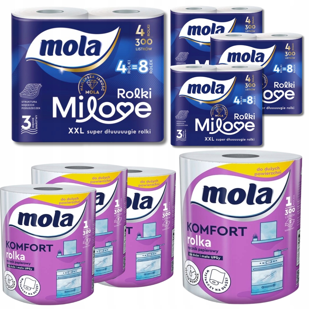 Туалетная бумага Mola Milove 3-слойная 4 шт. (300 листов) х 4 упаковки + бумажное полотенце Mola Komfort х 4 упаковки