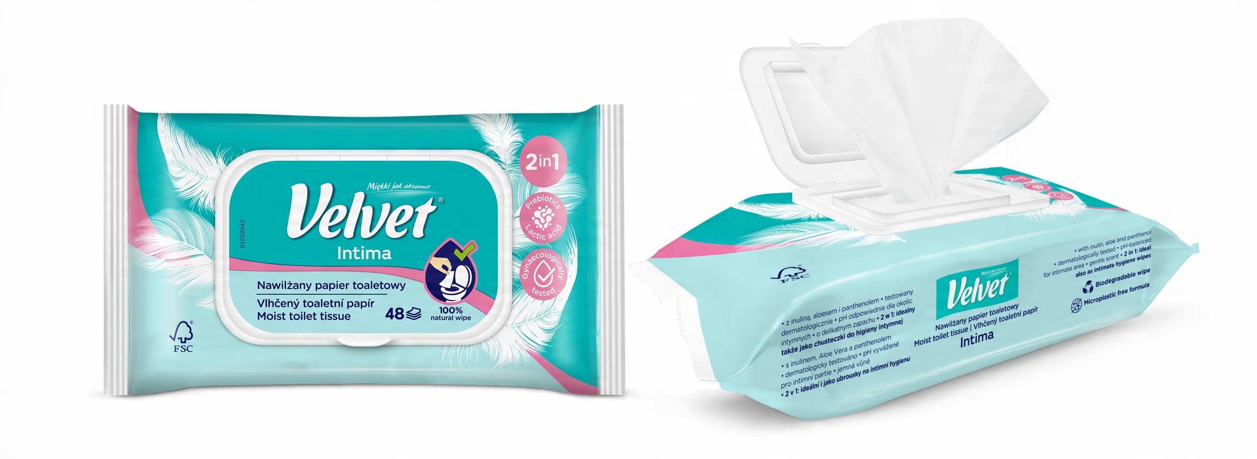Для современногоухода 2в1, созданный с учетом потребностей женщин. Откройте для себя новый стандарт туалетной гигиеныс Velvetвлажной туалетной бумагой, которая дополняет стандартную туалетную бумагу. Благодаря специально разработанной косметической формуле Velvet Intima также можно использовать в качестве салфеток для интимной гигиены.