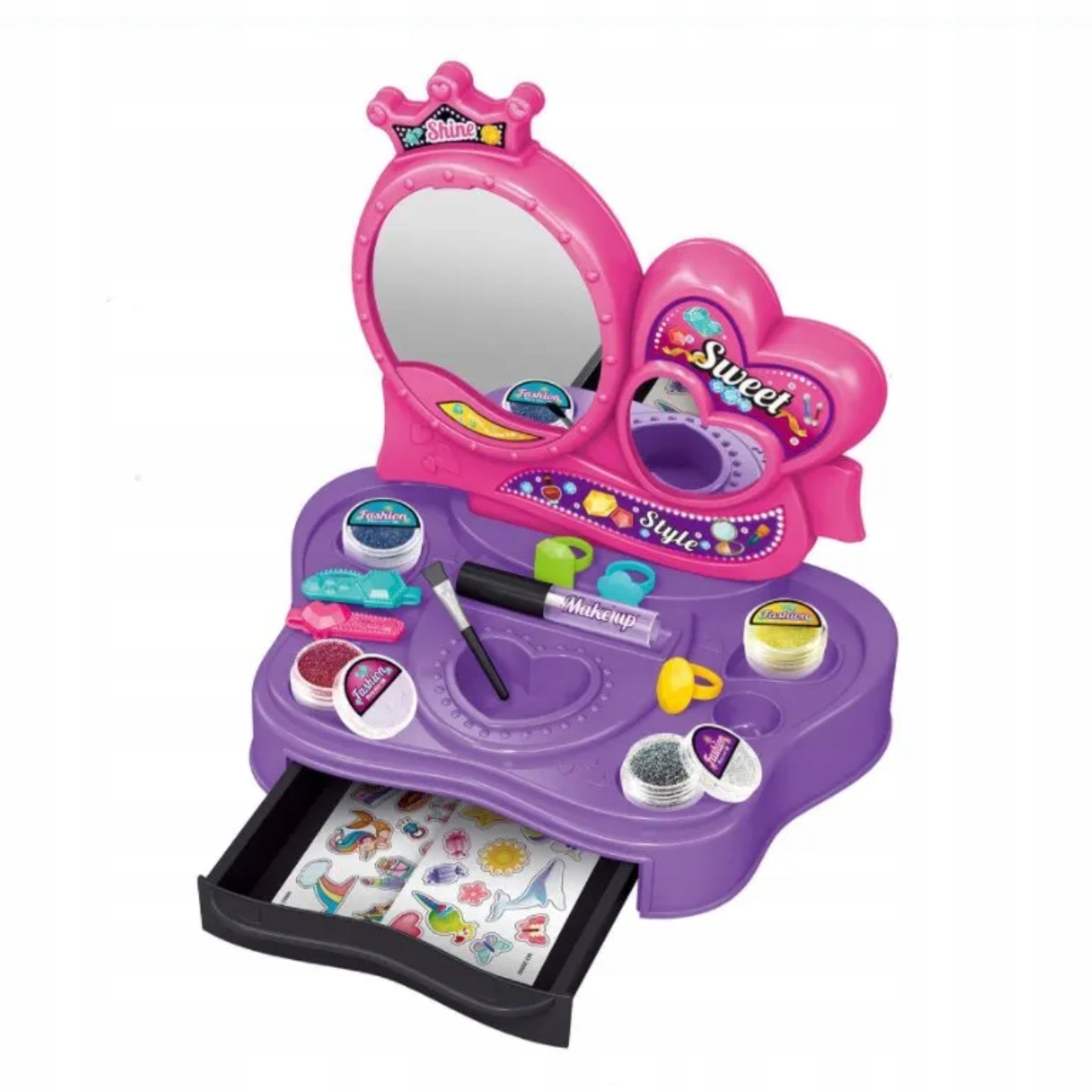 В наборе есть все необходимое, чтобы почувствовать себя в настоящем салоне красоты. В комплект входит туалетный столик, 4 рассыпных блестки для украшения, 2 набора наклеек для татуировок на ногтях и коже, 4 красивых кольца, мягкая кисточка, 2 элегантные заколки и лак (пустой внутри). Детали позволяют детям экспериментировать с различными стилями, узорами и цветами, давая им возможность проявить свои творческие способности.