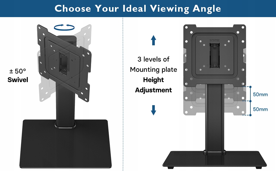 Регулировка угла поворота и высоты: наша подставка для телевизора имеет три уровня регулировки высоты по 5 см для обеспечения наилучших впечатлений от просмотра. Угол поворота составляет +/- 50° (максимальный угол поворота зависит от размера телевизора) и обеспечивает максимальную гибкость просмотра.