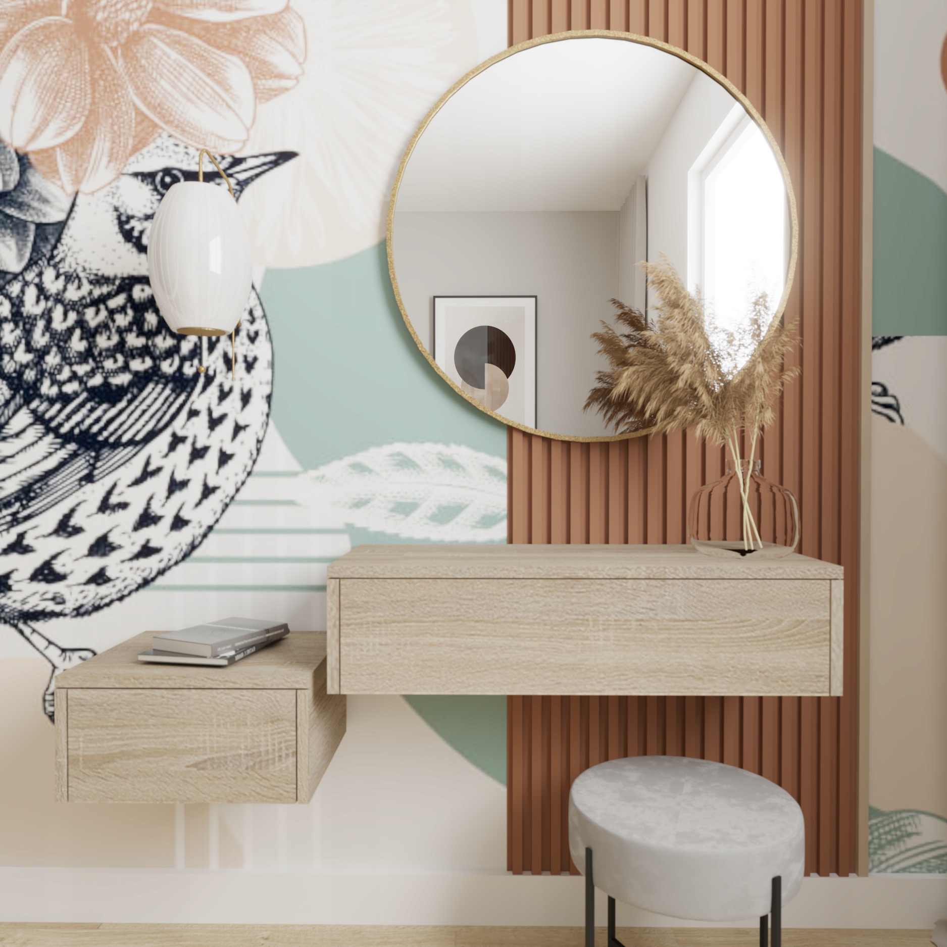 Уникальный туалетный столик с множеством применений, он также может служить в качестве туалетного столика или письменного стола в спальне. Его также можно использовать в прихожей для подручных вещей или просто как элемент декора. Благодаря своему внешнему виду он подходит как к классическому, так и к современному интерьеру. Его висячая форма добавит легкости в ваш интерьер, а также позволит нам поддерживать в чистоте труднодоступные места.