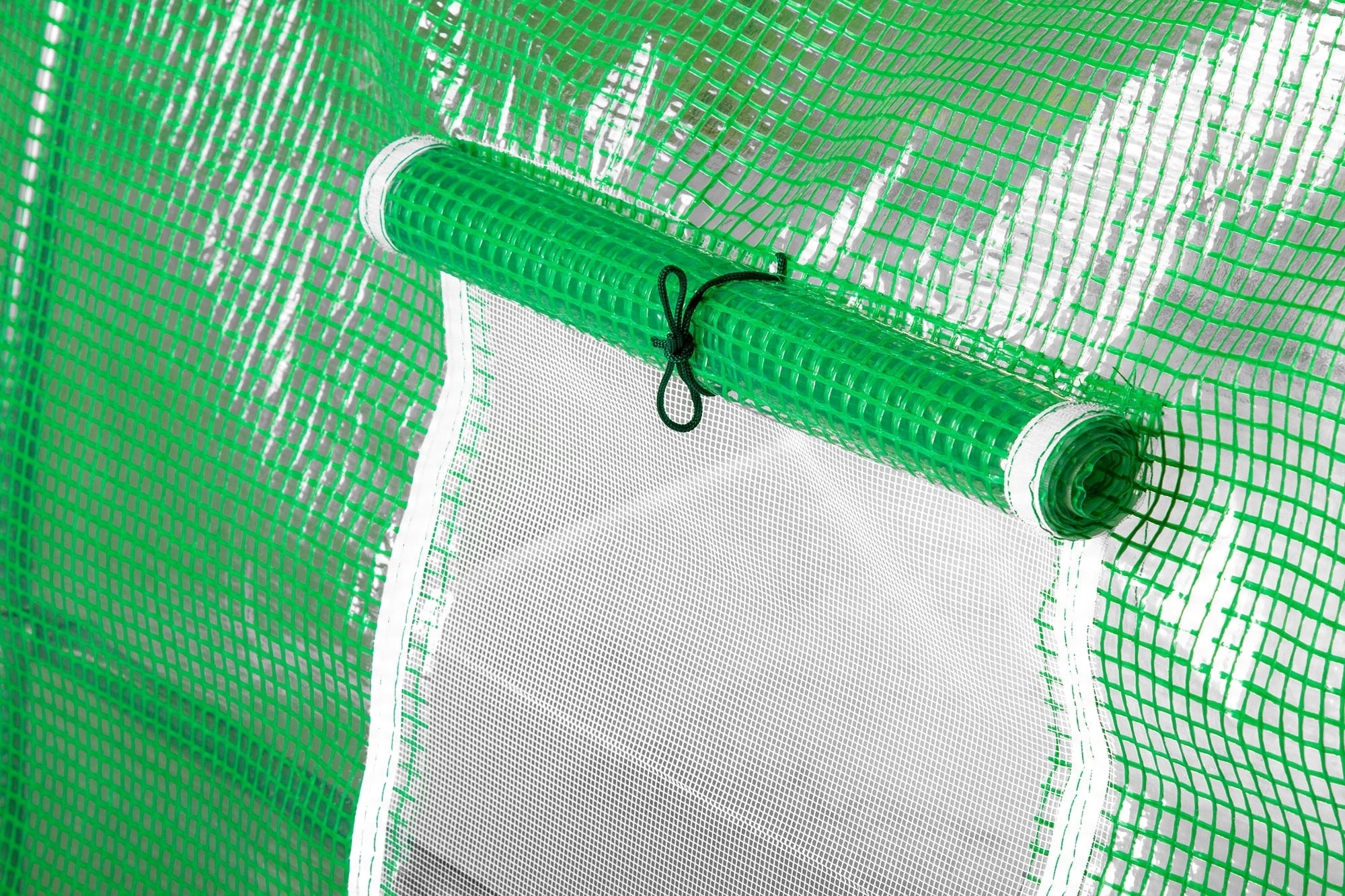 - Крышка была сделана из водонепроницаемого материала PE с весом 140 г/м2. Теплоизоляция чрезвычайно эффективна и ускоряет рост урожайности благодаря против чрезмерного проникновения солнечного света внутри теплицы. Фартук очень длинный, благодаря тому, что излишки, лежащие на почве, могут быть покрыты почвой и дополнительно запечатывают внутреннюю часть туннеля.