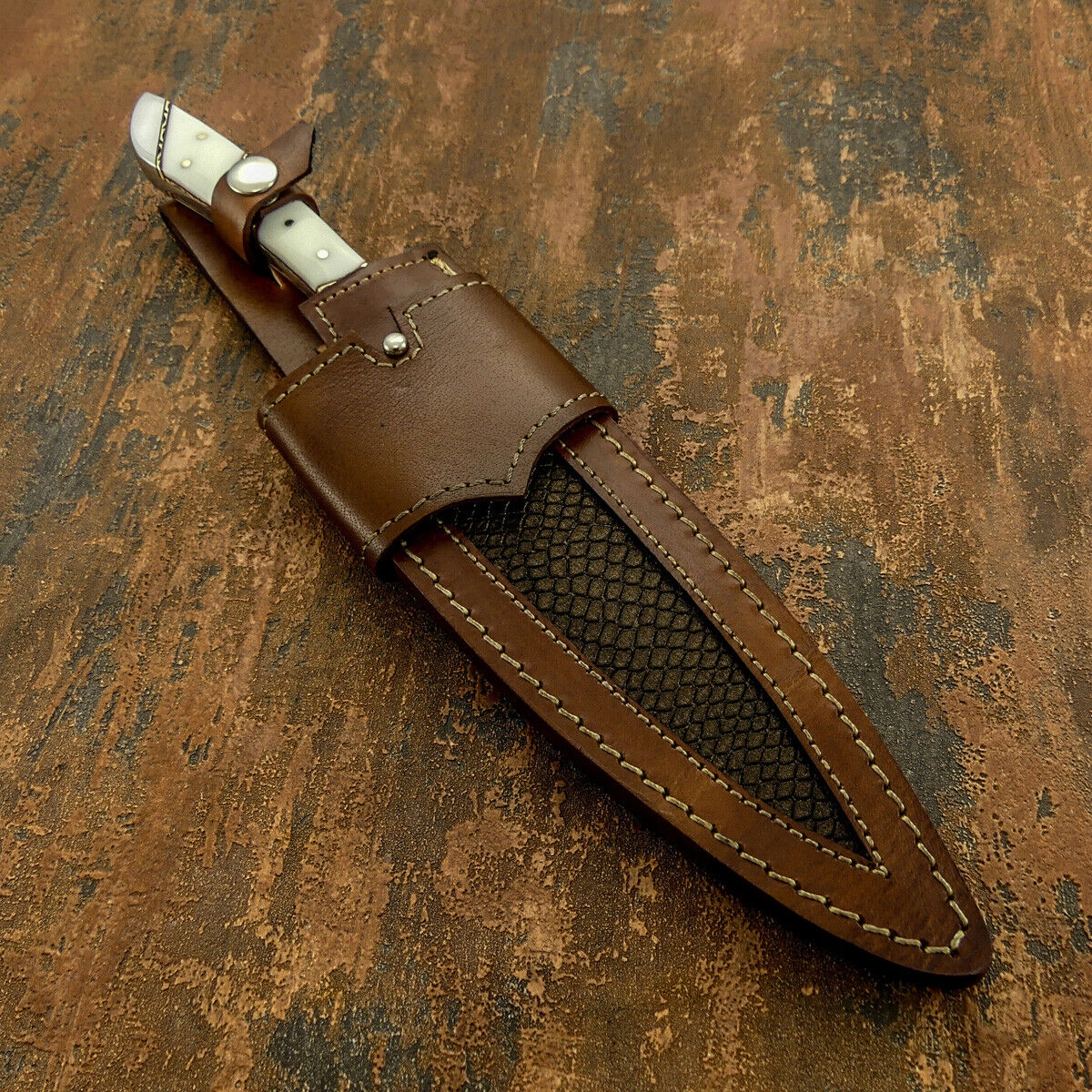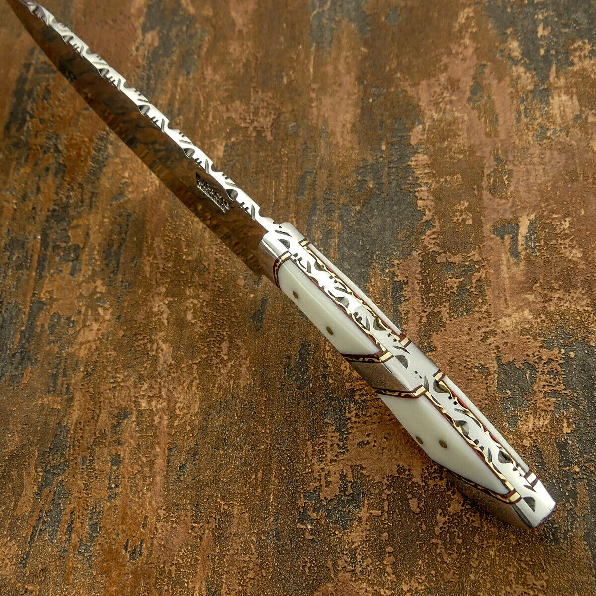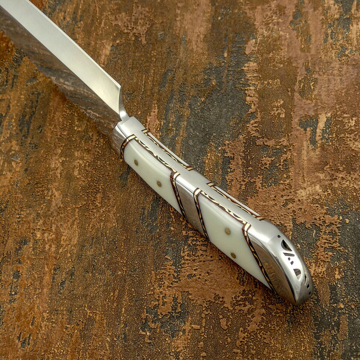 Рукоятка: красивая, из акрила, имитация слоновой кости, латунные декоративные пластины, стальные элементы, интегрированные с лезвием, все соединено латунными шпильками и эпоксидной смолой, вся рукоять украшена красивой ювелирной прорезью,