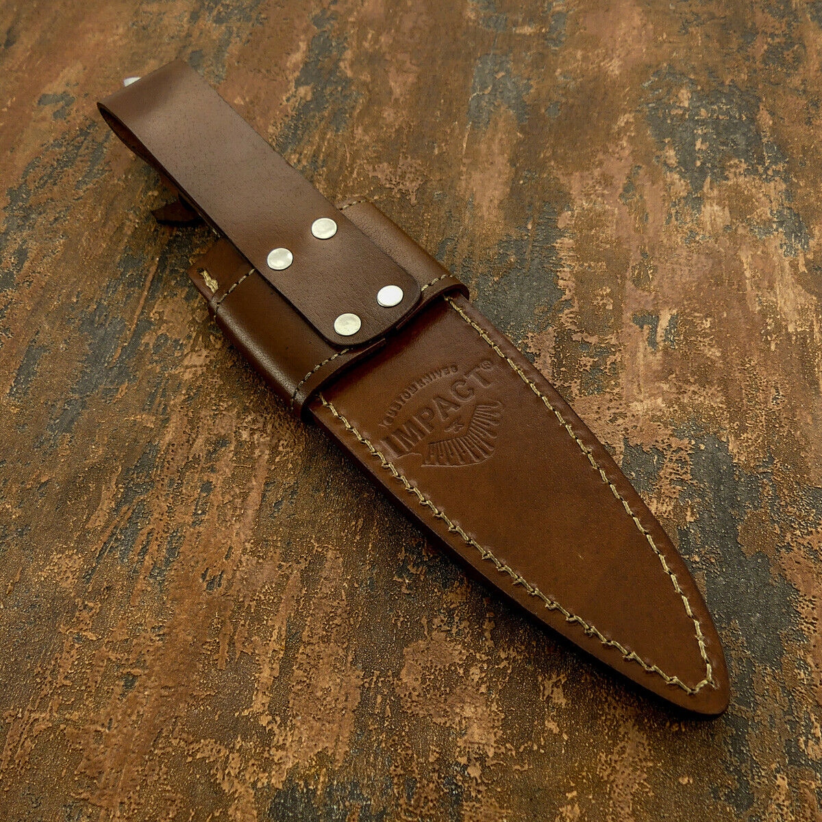 Ножны: из прошитой толстой телячьей кожи, двухсекционные, подписаны логотипом бренда Impact,